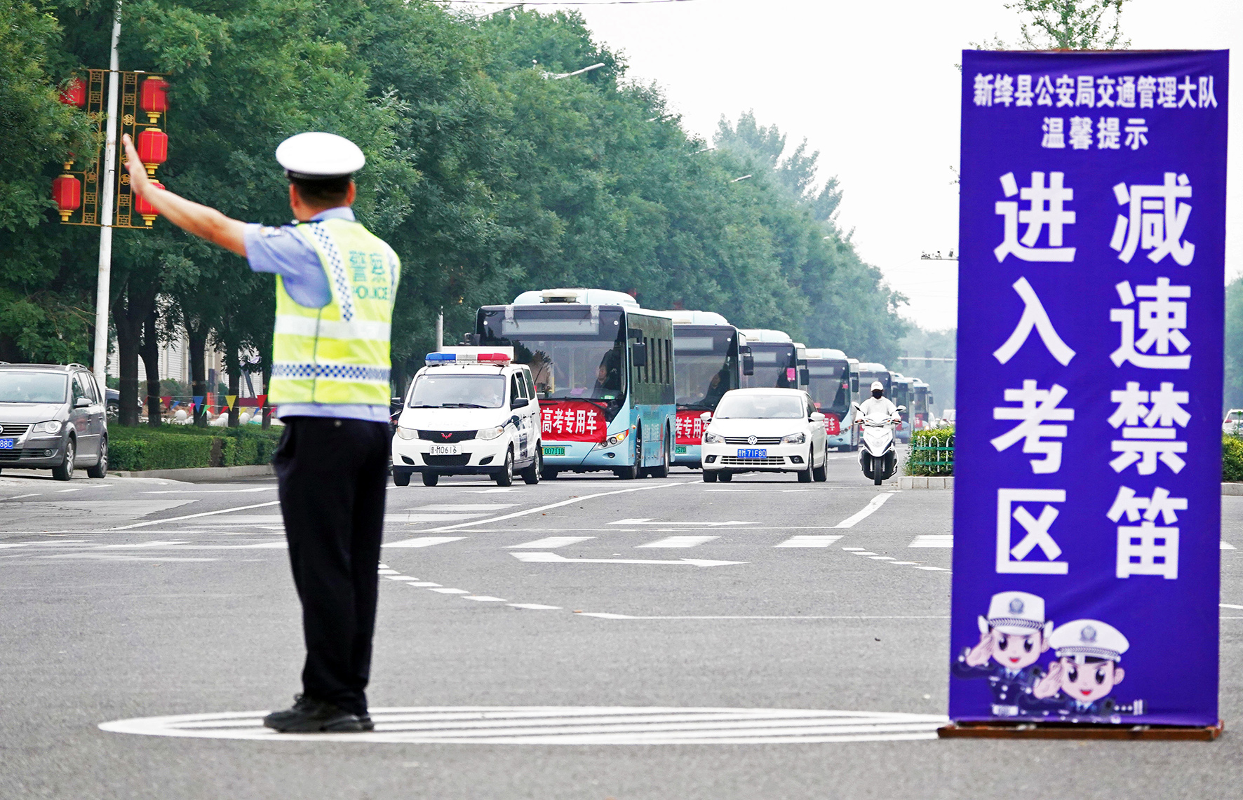 6月7日,山西省運城市新絳縣公安局交警大隊民警指揮考生接送車有序進入新絳中學(xué)考區(qū)。