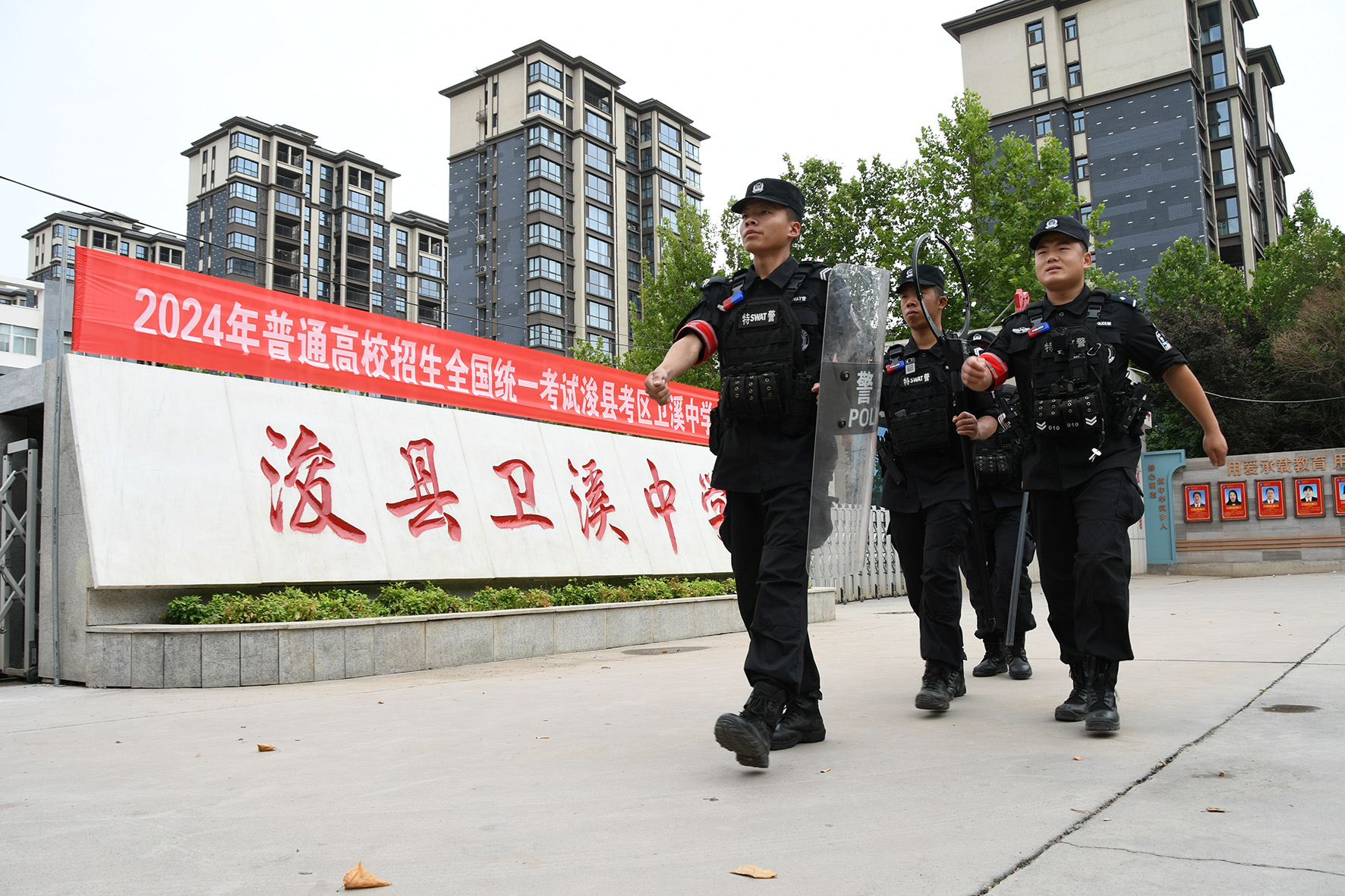 6月7日,河南省??h公安局民警輔警在高考考點巡邏執(zhí)勤。