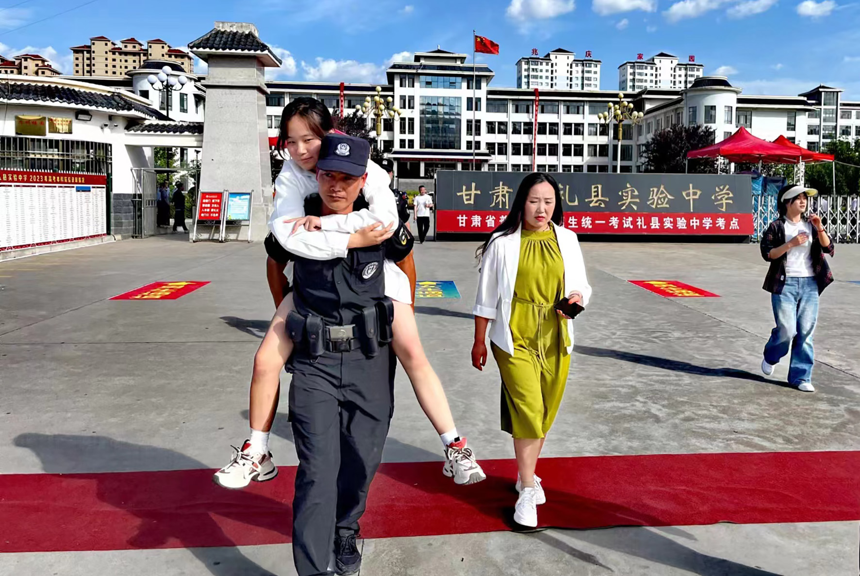 6月7日,甘肅省禮縣公安局特巡警在實驗中學(xué)考點護送一位行走不便的考生走出考場。