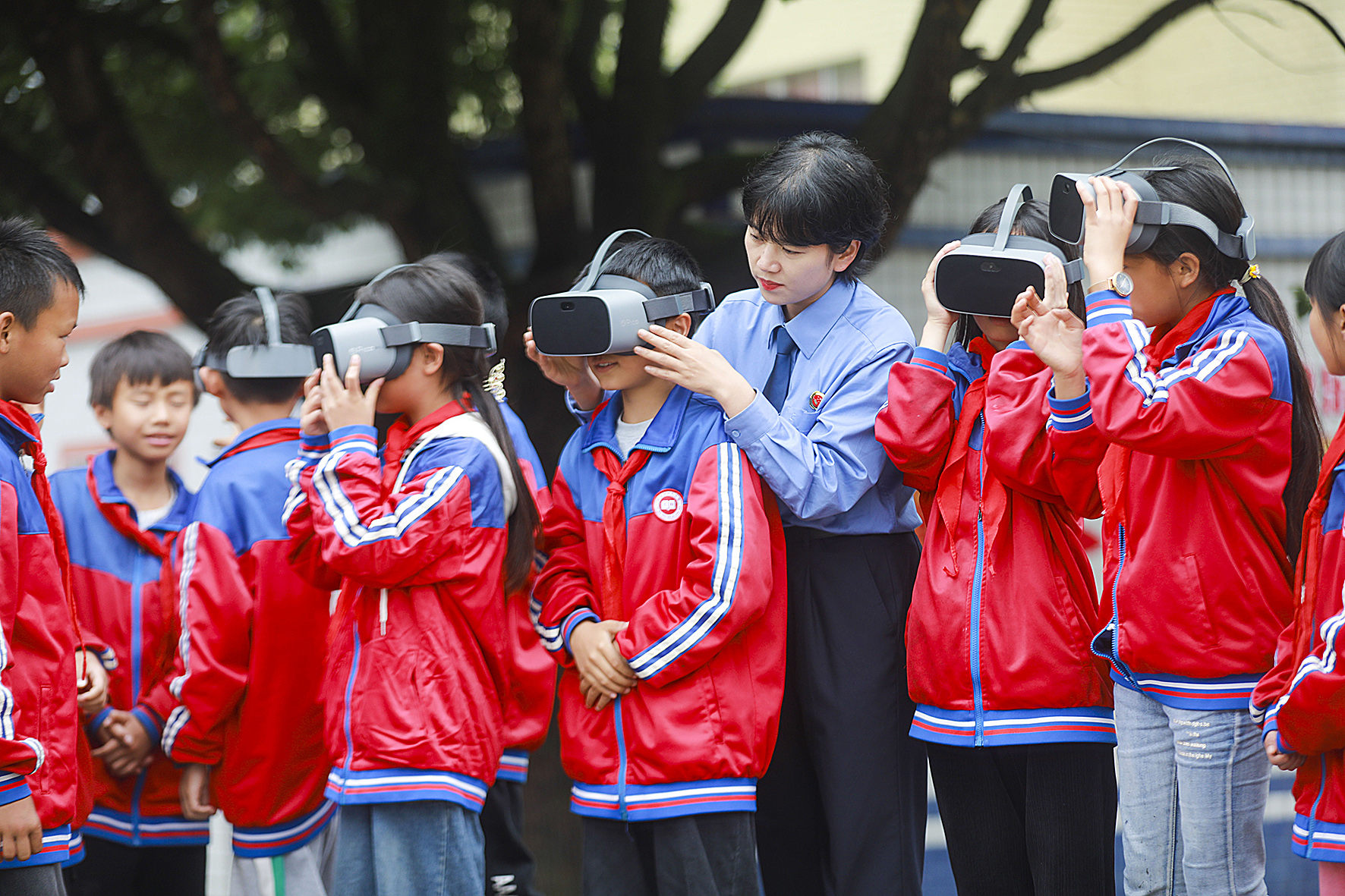 圖為檢察官指導學生利用VR眼鏡體驗毒品的危害。
