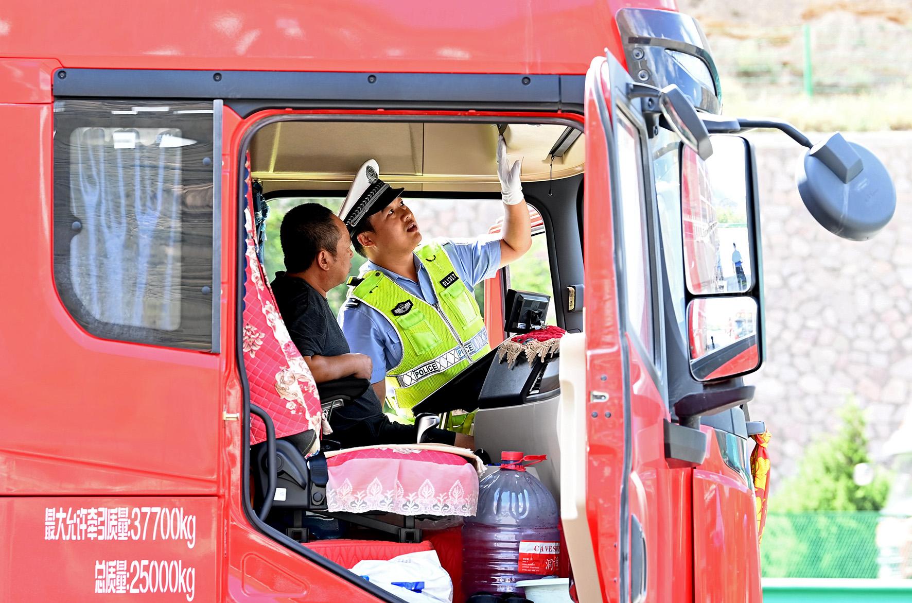 7月31日,甘肅省蘭州市公安局交警支隊(duì)民警在蘭海高速蘭臨段聯(lián)防聯(lián)控交管站,對(duì)過往三軸以上的大貨車逐車進(jìn)行登記檢查,提醒駕駛?cè)藝?yán)格遵守高風(fēng)險(xiǎn)路段規(guī)定,注意防范高溫天氣,切勿疲勞駕駛。