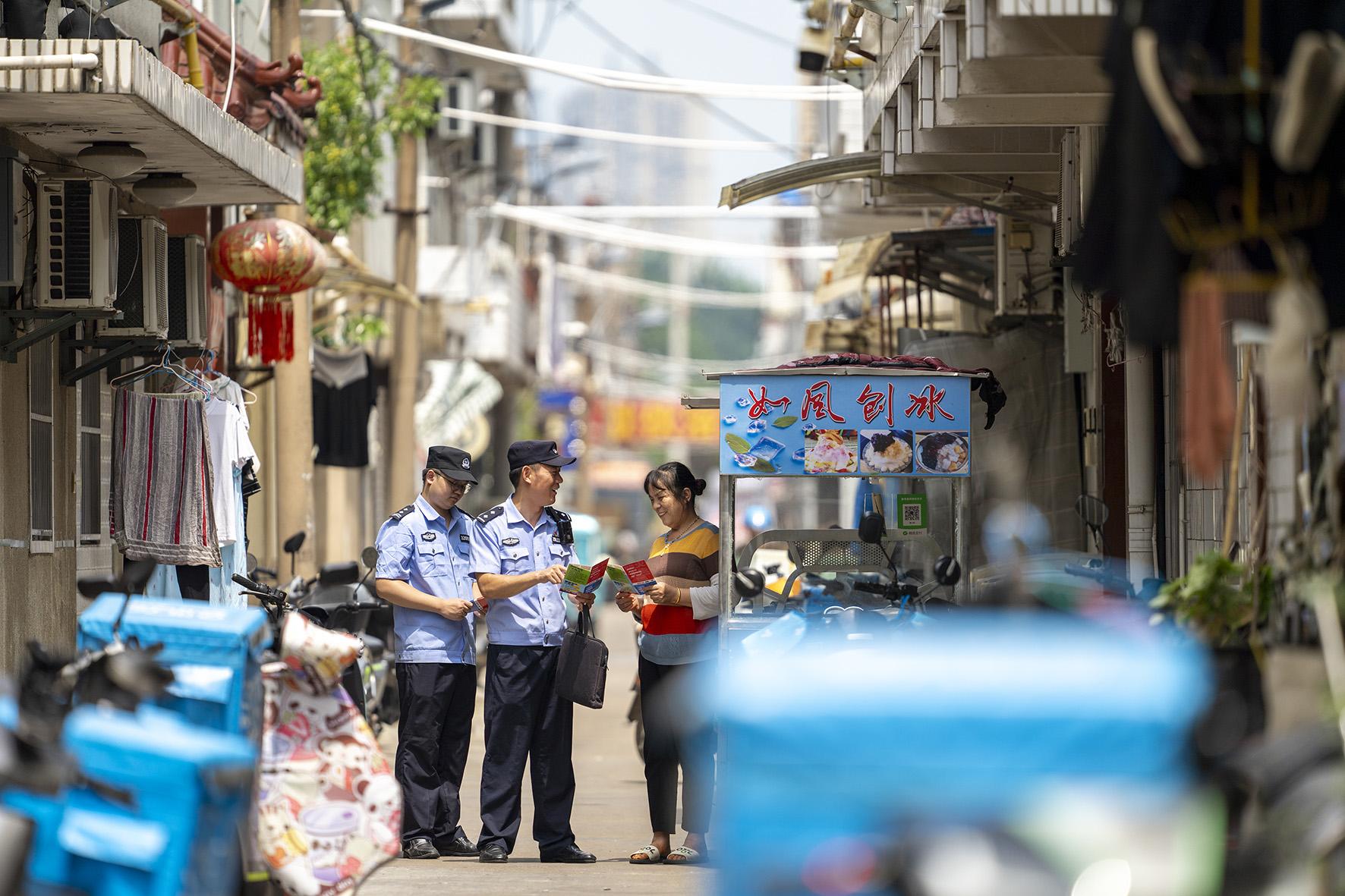8月5日,在江蘇省鹽城市亭湖區(qū)萬(wàn)戶(hù)新村,鹽城市公安局亭湖分局五星派出所社區(qū)民警冒著高溫在轄區(qū)走訪。