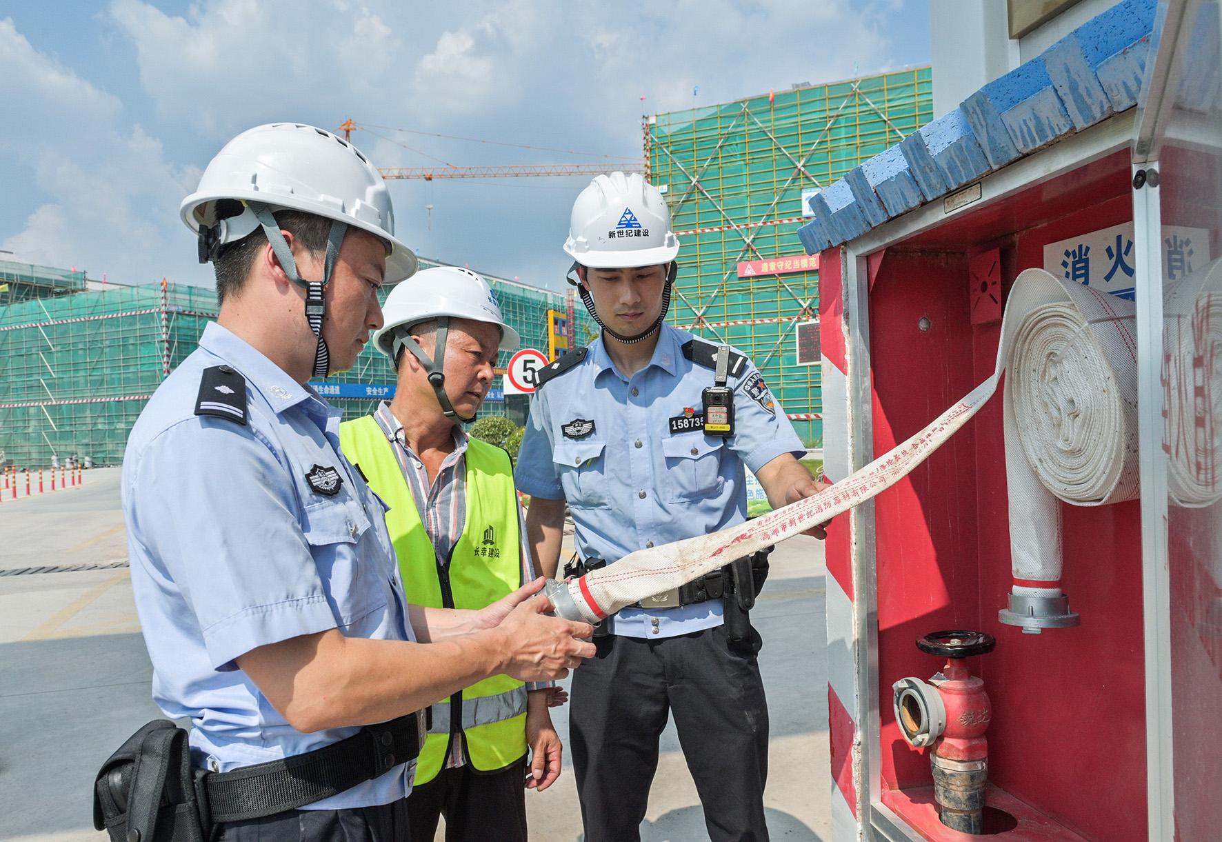 圖為 8月6日,壺山派出所 “項目警長”在重點項目施工現場開展安全檢查,并為高溫下作業(yè)的建設者送上防暑藥品。