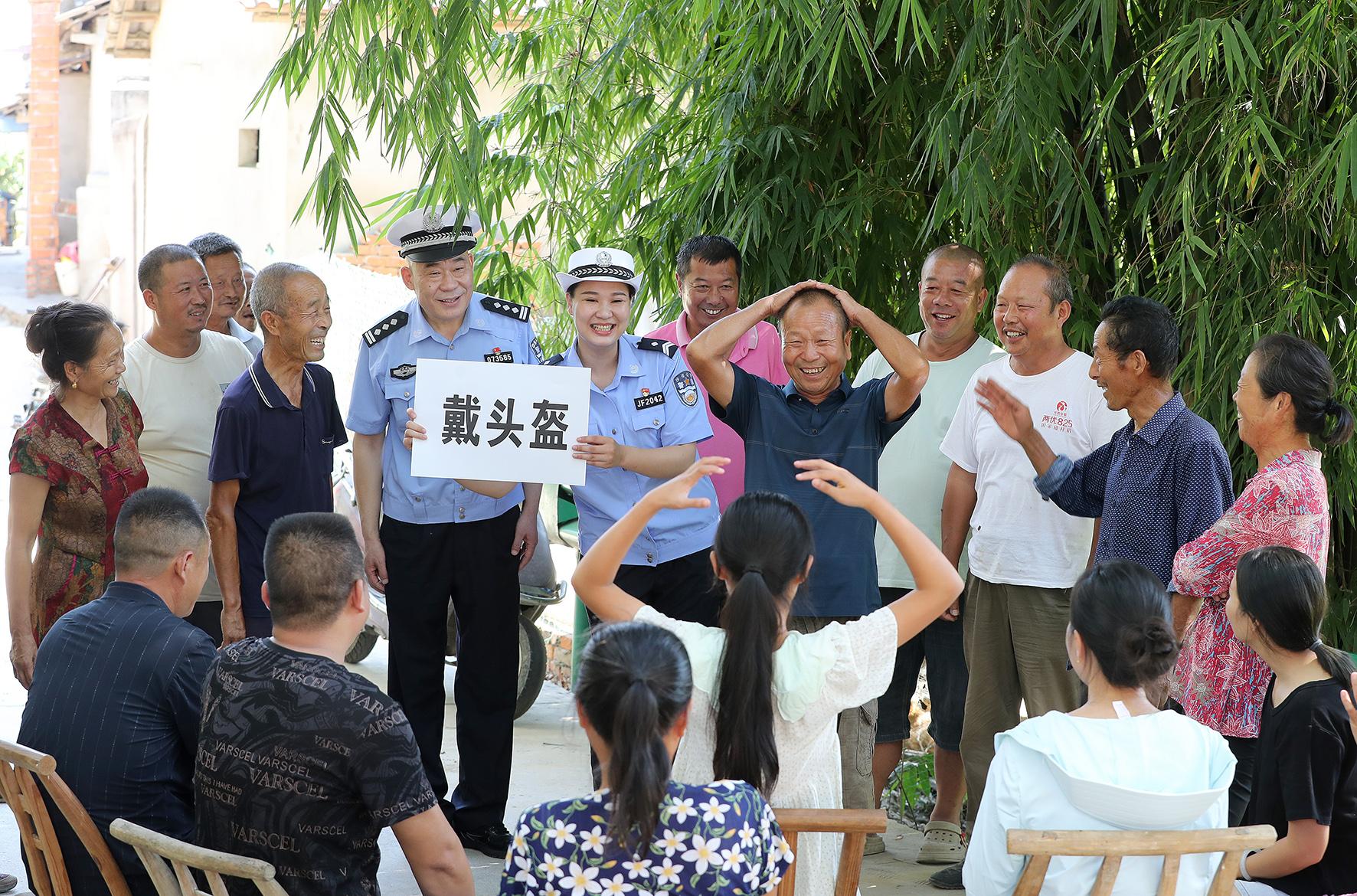 8月13日,在湖北省荊門市沙洋縣李市鎮(zhèn)新城村,沙洋縣公安局交警大隊民警通過“我比你猜”趣味活動,向村民宣傳交通安全知識。