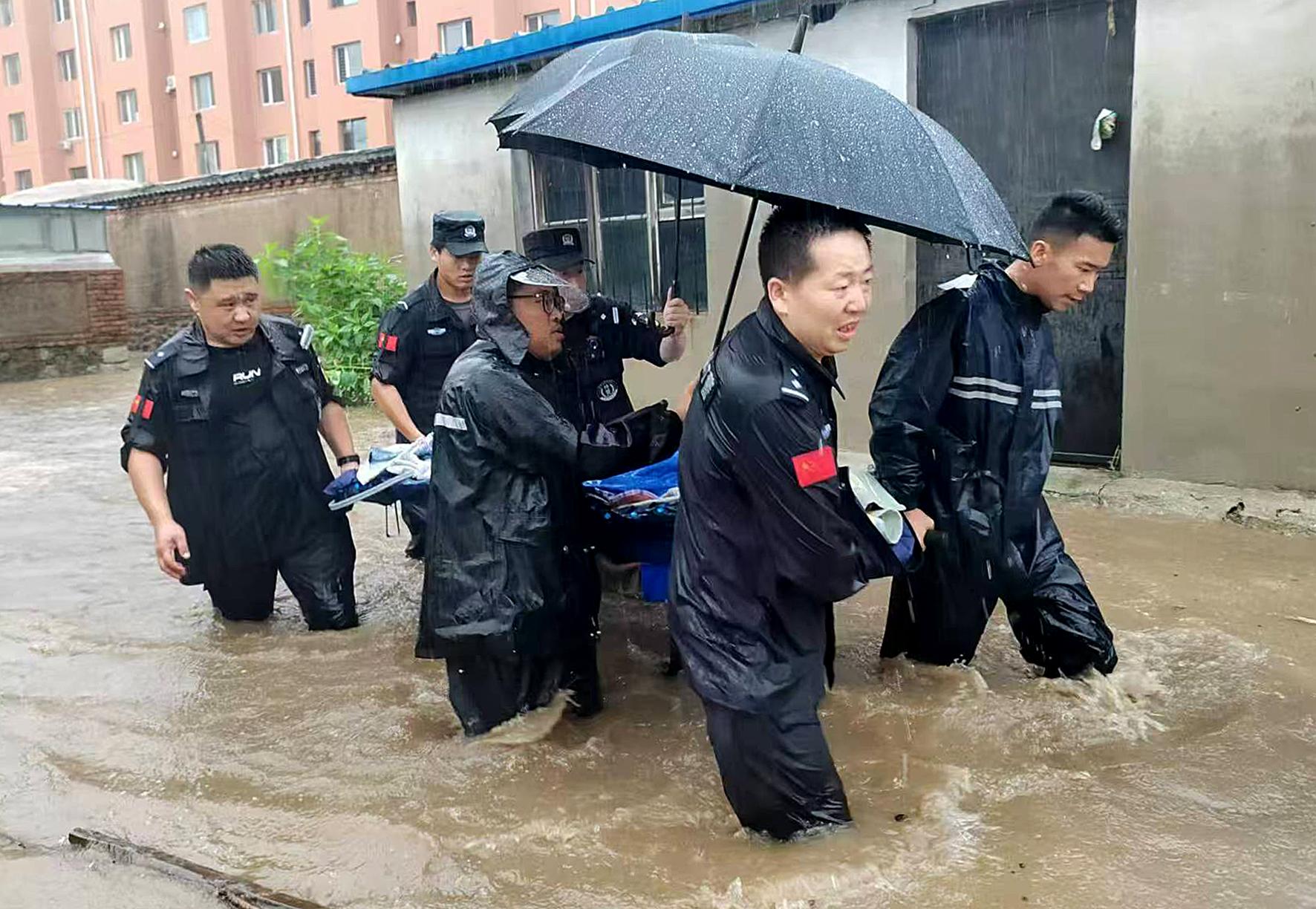 8月20日,遼寧省葫蘆島市建昌縣公安局鎮(zhèn)北派出所民輔警和巡特警隊員在暴雨中挨戶排查險情時,發(fā)現受災的平房里有一位重病老人,立即用擔架將老人送往救助站。