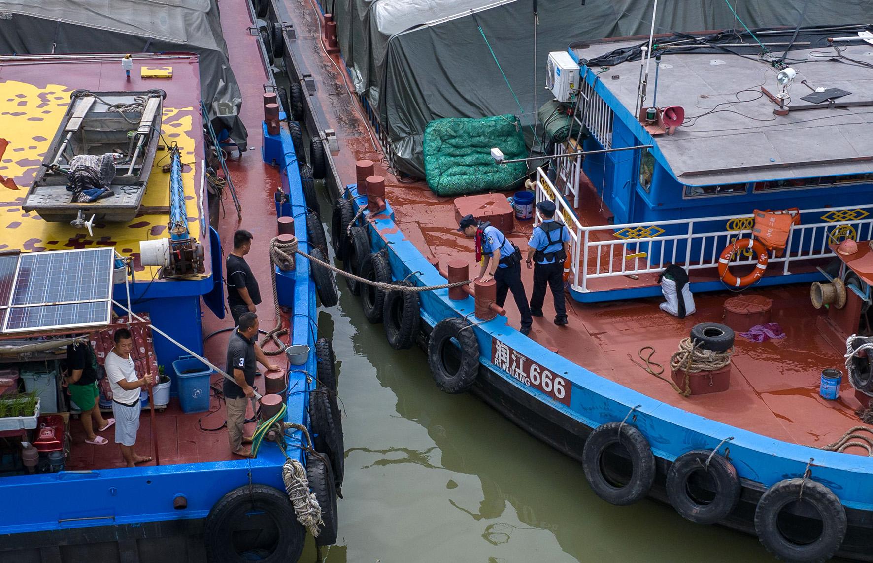 9月20日,長(zhǎng)江航運(yùn)公安局鎮(zhèn)江分局鎮(zhèn)江派出所水上巡邏隊(duì)民警在江蘇省鎮(zhèn)江市大港碼頭港池內(nèi)開(kāi)展安全隱患排查,以應(yīng)對(duì)臺(tái)風(fēng)“普拉?!痹俅蝸?lái)襲。