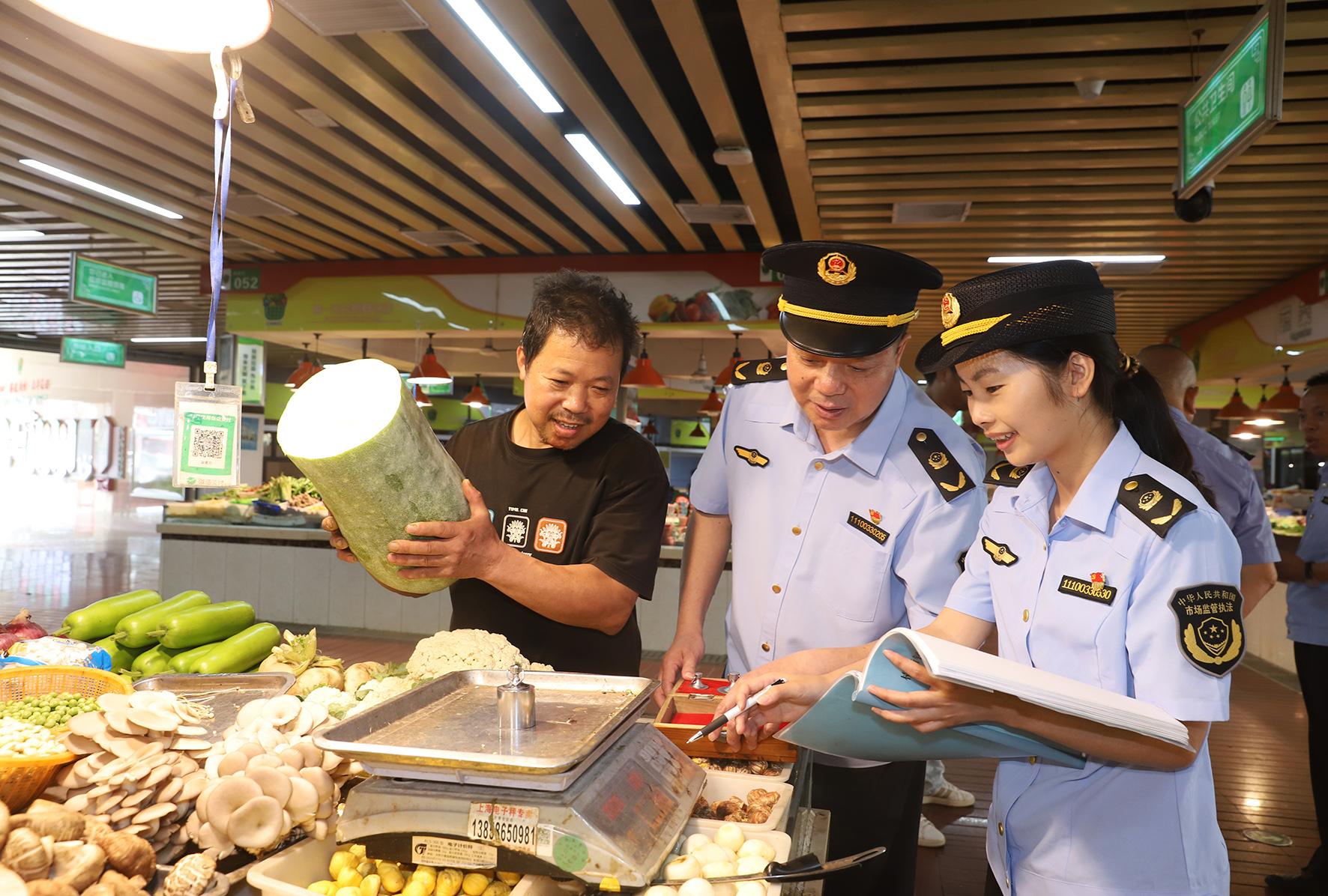 10月18日,浙江省臺州市路橋區(qū)橫街鎮(zhèn)市場監(jiān)督管理所執(zhí)法人員在菜市場里利用標準砝碼測試計量秤的精準度。