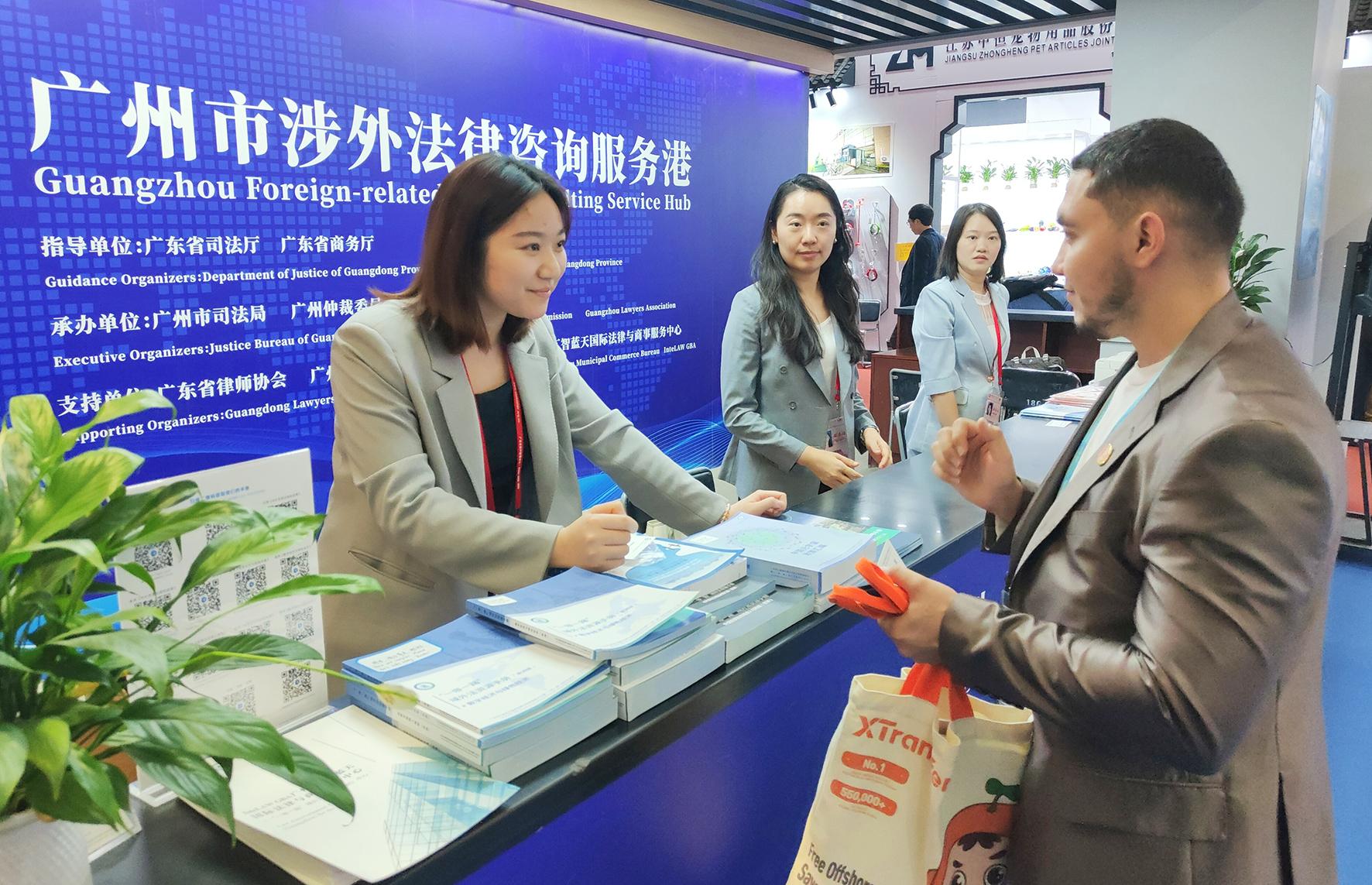 11月2日,第136屆廣交會(huì)三期廣州市涉外法律咨詢服務(wù)港,工作人員正在為客商解答涉法問題。