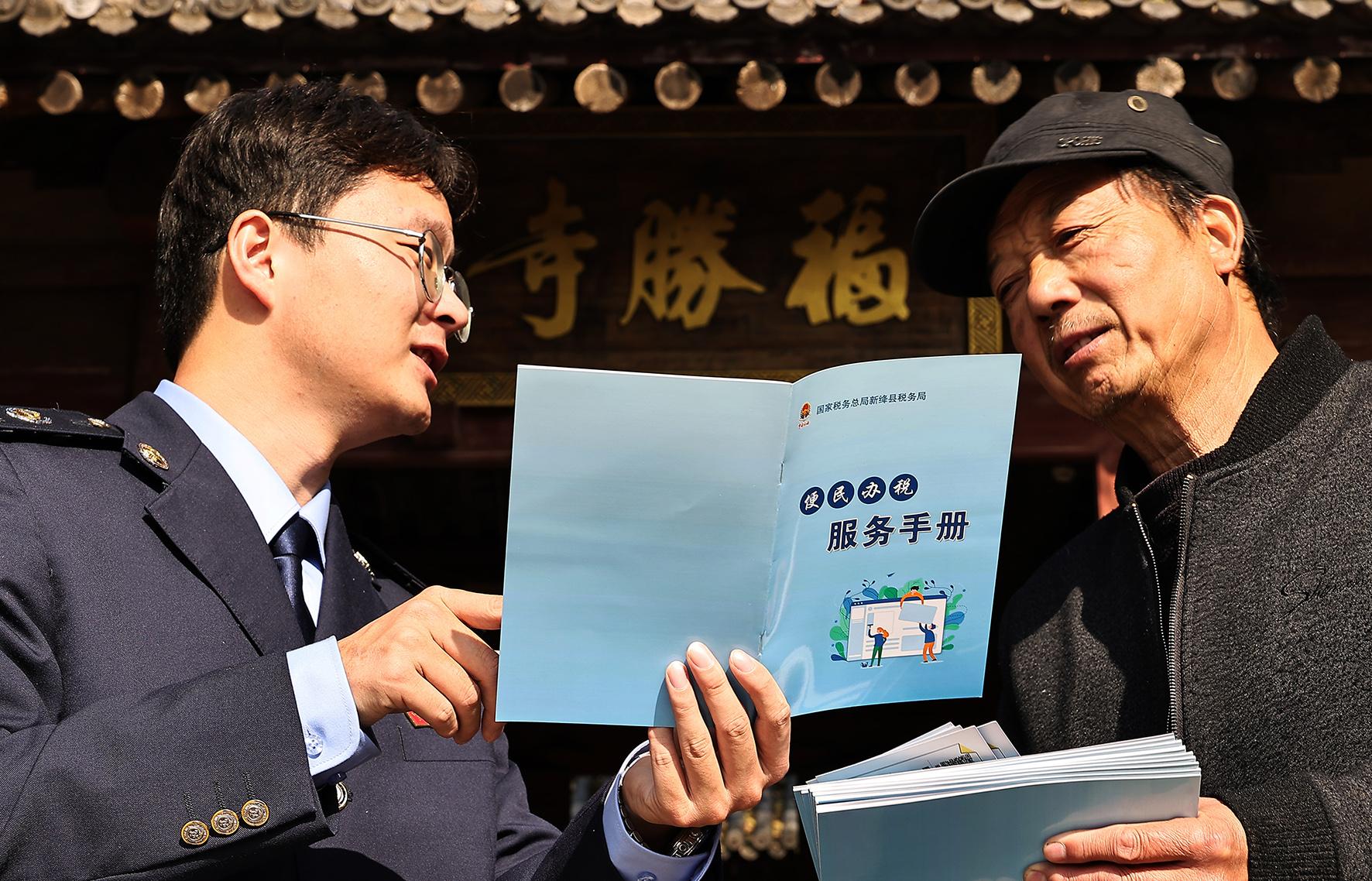 11月5日,山西省新絳縣稅務(wù)局稅宣人員在光村福勝寺向文創(chuàng)人員宣傳文創(chuàng)產(chǎn)品稅惠新政。