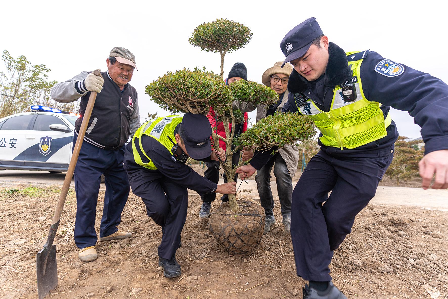 圖為12月10日,民警來到轄區(qū)園藝村將一株失竊的“瓜子黃楊樹”送還給種植戶,并向種植戶開展了防盜防騙安全宣傳。