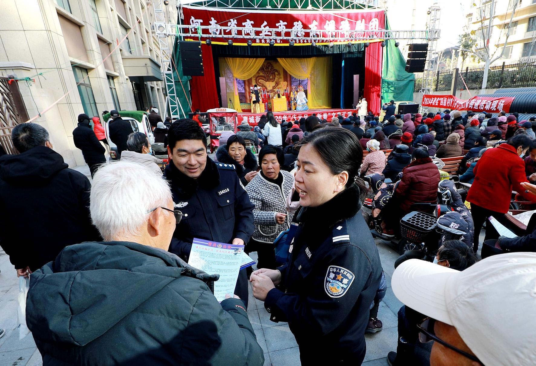 12月17日,山東省曹縣公安局曹城派出所民警利用送戲進(jìn)社區(qū)的有利時(shí)機(jī),開展反詐騙宣傳活動。