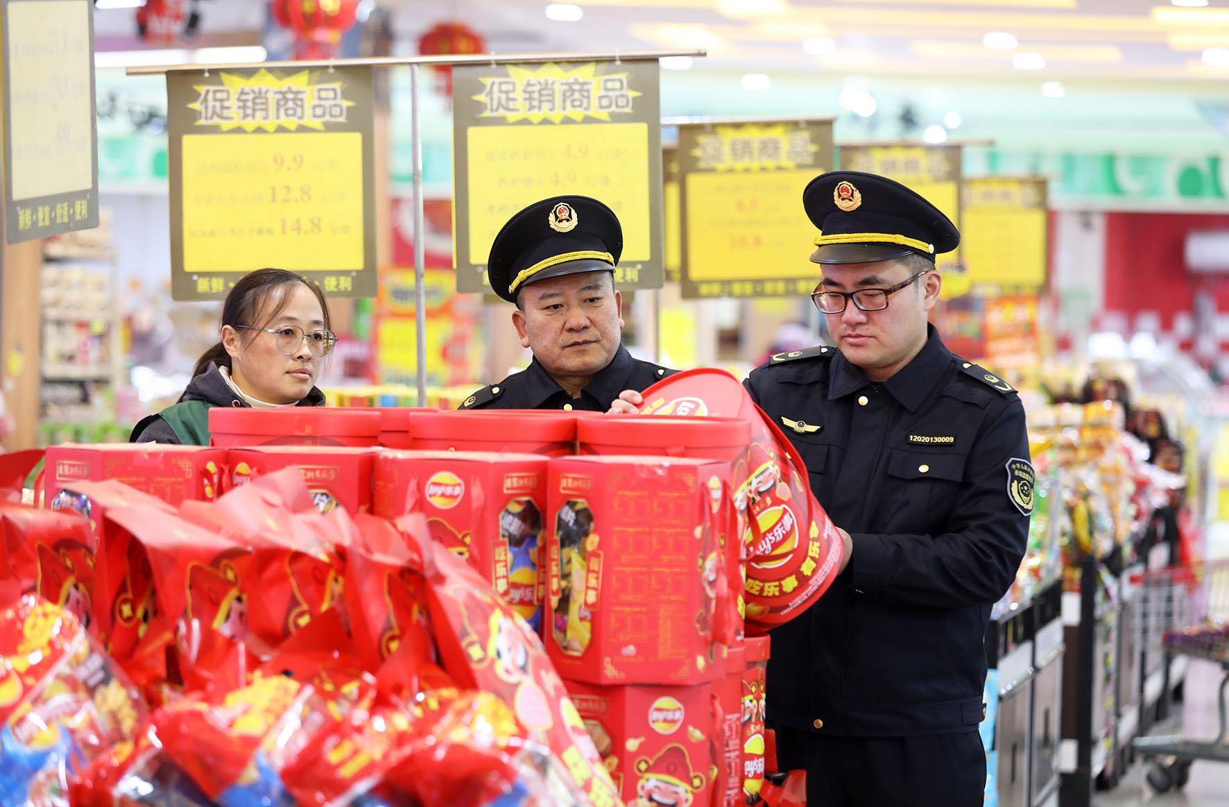 圖為雙堆集鎮(zhèn)市場監(jiān)督管理所工作人員在市場進行檢查。