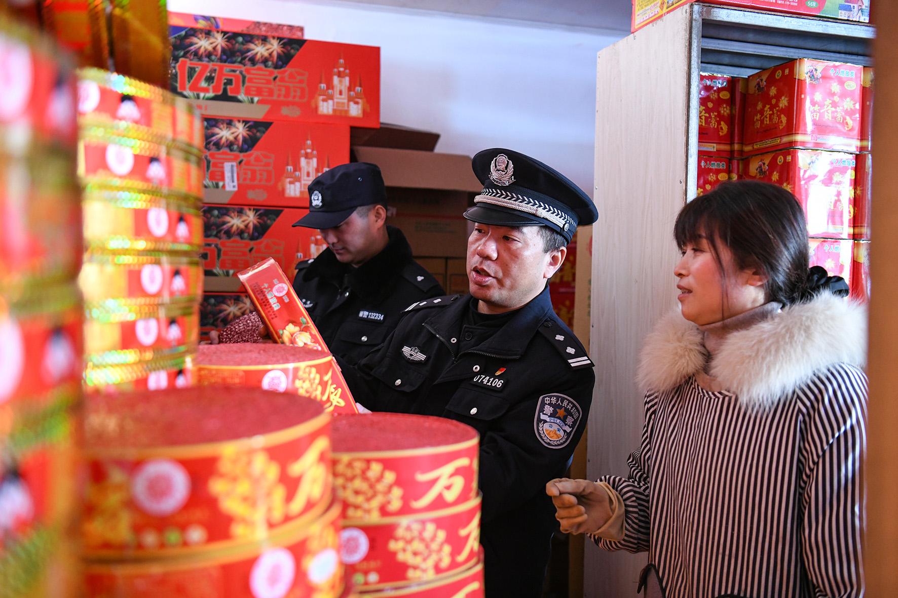 1月9日,安徽省馬鞍山市含山縣公安局花山派出所民警對煙花爆竹零售點進(jìn)行檢查。