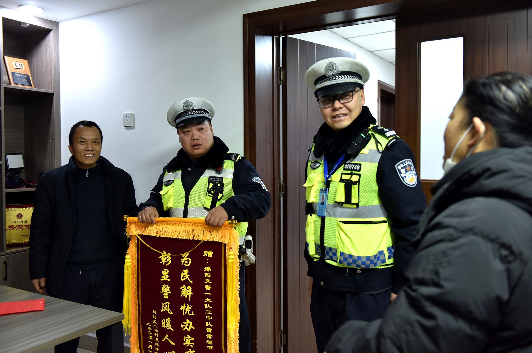 1月10日,第五個中國人民警察節(jié)。一對中年夫婦手拿錦旗走進(jìn)了四川省綿陽市公安局交警支隊直屬一大隊,感謝民輔警巡邏時,將80多歲、迷路的父親安全送回家中。