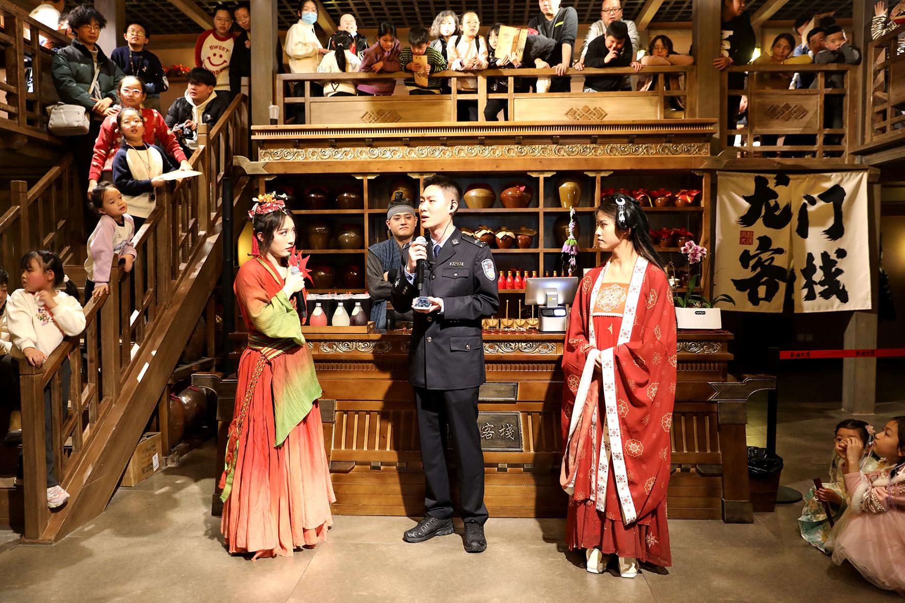 2月21日,甘肅省蘭州市公安局?jǐn)y手招商銀行在蘭州中心風(fēng)起大漢·沉浸式演藝街區(qū),開展“穿越古今·暢聊反詐”線上+線下反詐宣傳活動,兩個小時(shí)直播,20.5萬人在線互動觀看,游客紛紛駐足互動參與。