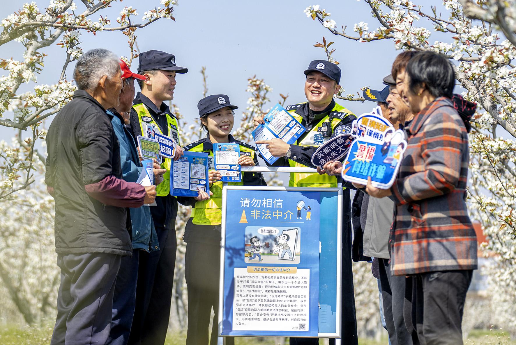 4月1日,上海市公安局崇明分局堡鎮(zhèn)派出所民警來到瀛南村梨園,向游客普及防范電信網(wǎng)絡(luò)詐騙、交通安全等知識(shí)。
