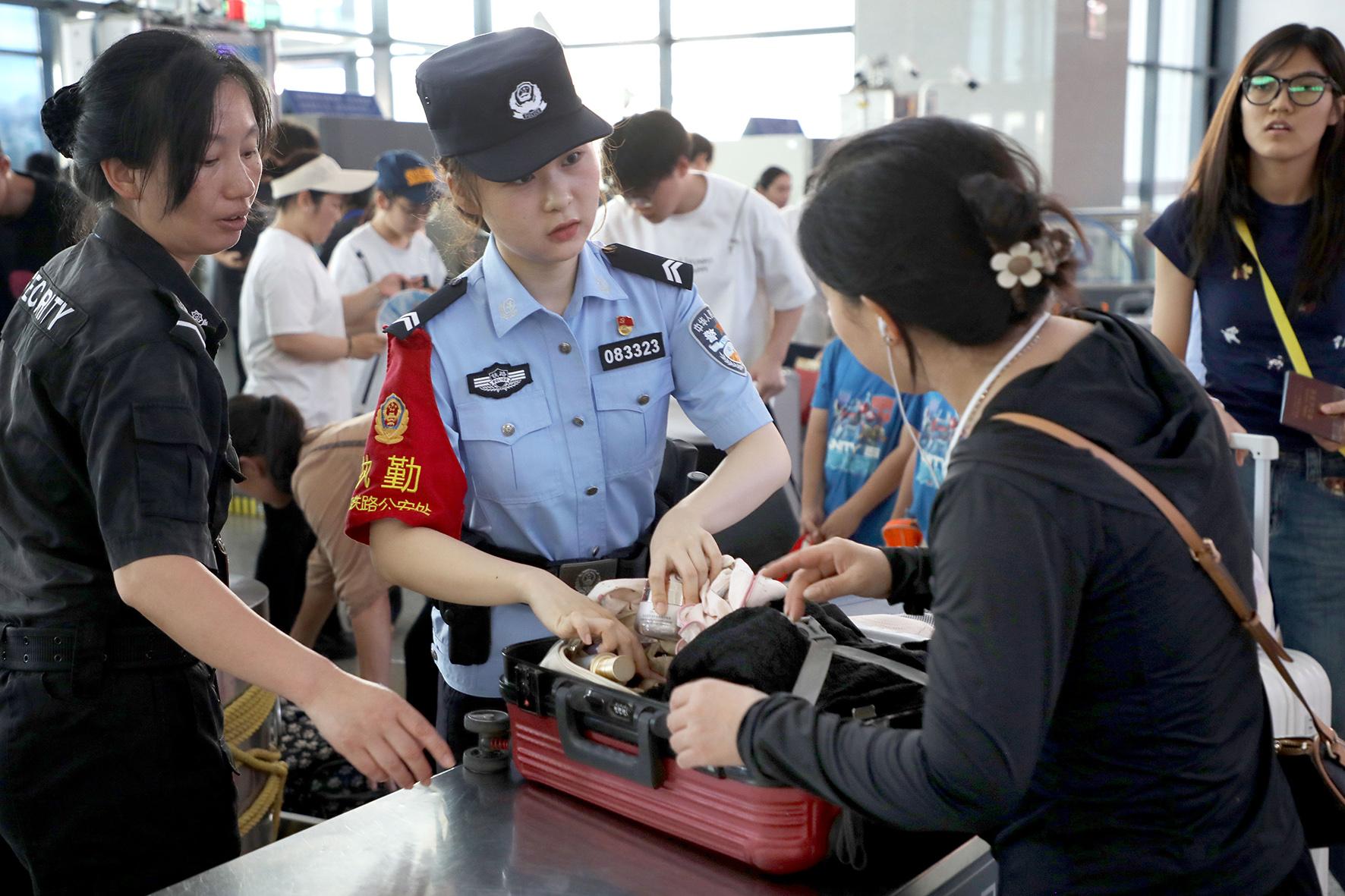 7月1日,上海鐵路公安局合肥鐵路公安處六安站派出所民警在對(duì)旅客攜帶物品進(jìn)行抽查。當(dāng)日,2025年鐵路暑運(yùn)拉開(kāi)帷幕。合肥鐵路公安處六安站派出所通過(guò)科學(xué)調(diào)配警力、細(xì)化工作措施、宣傳法治知識(shí)等,為暑運(yùn)旅客平安出行保駕護(hù)航。