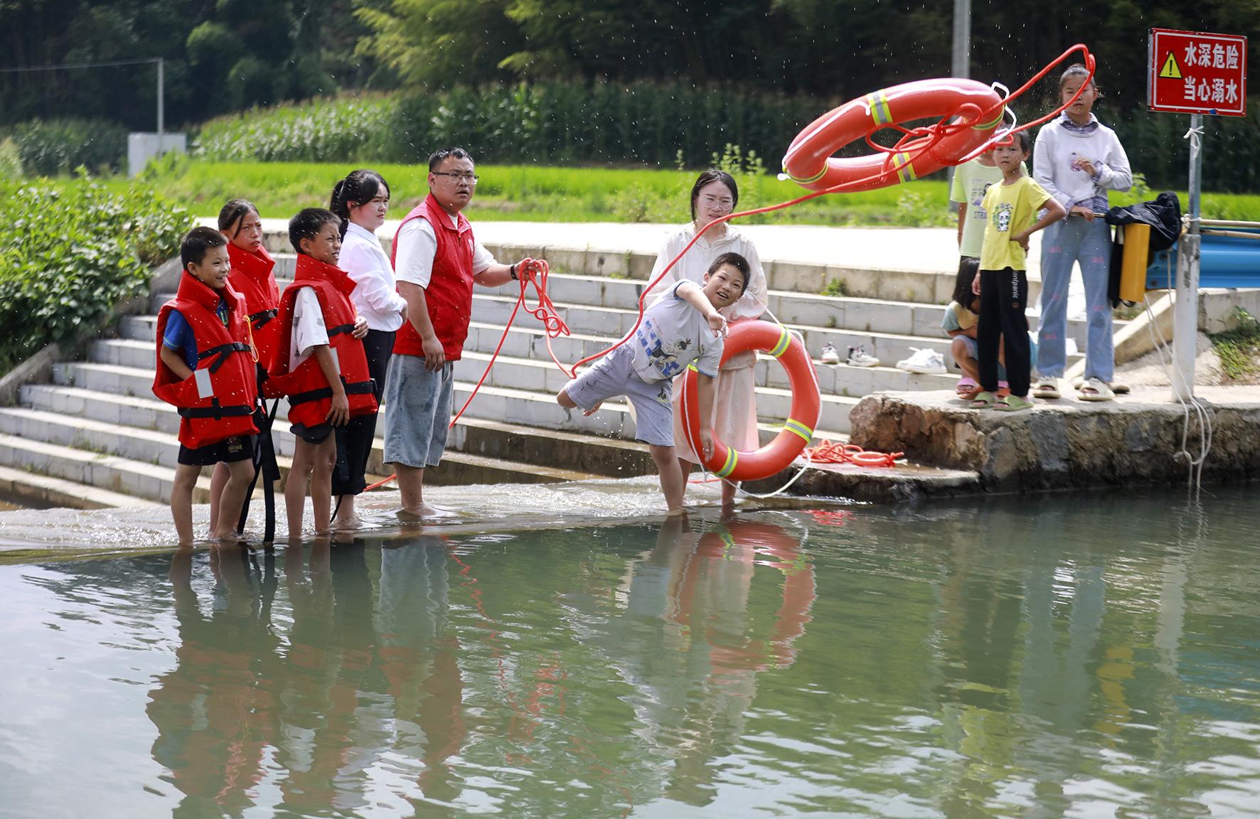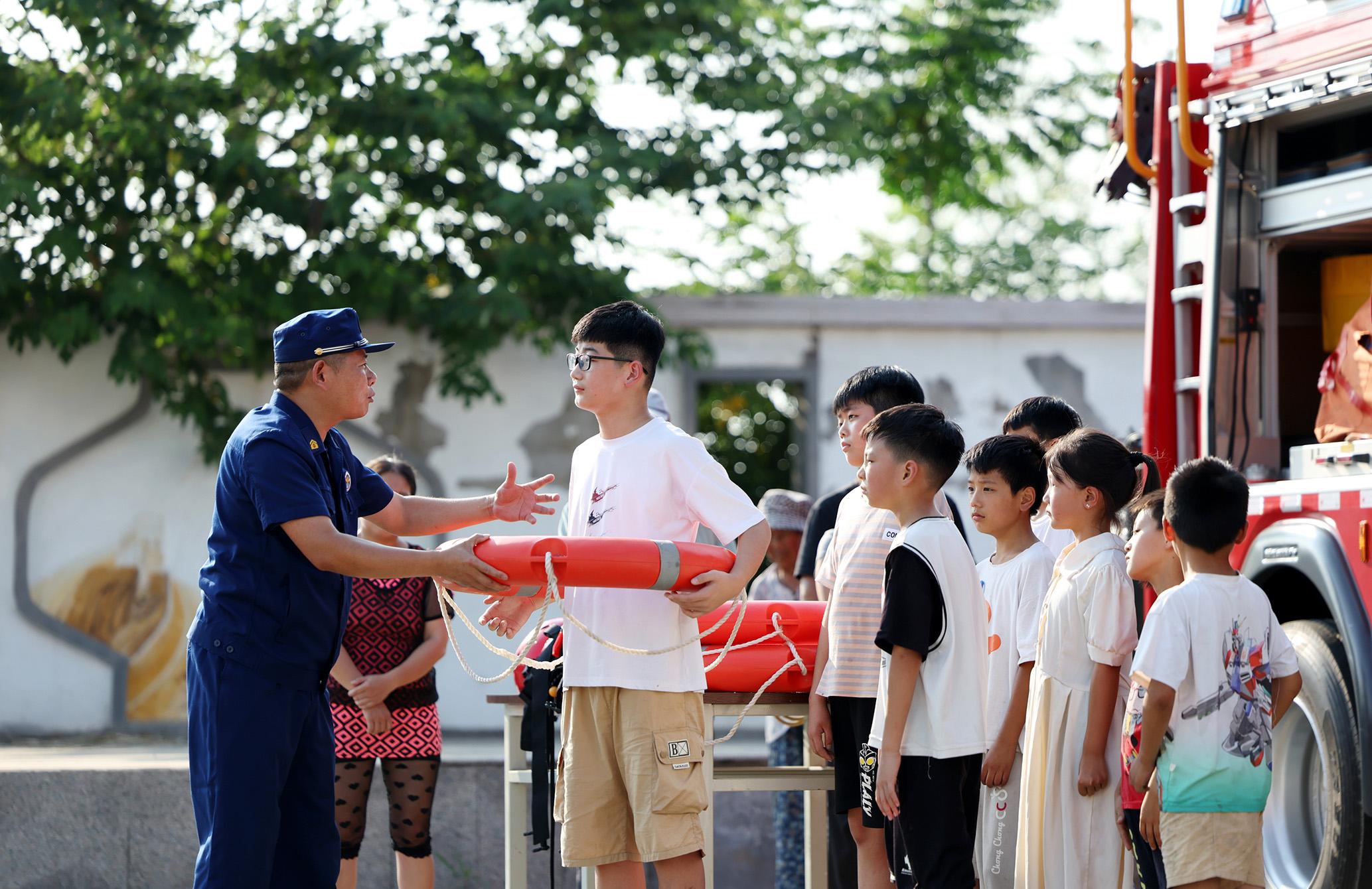 7月17日,在山東省臨沂市郯城縣郯城街道陵坡村,消防救援人員為放暑假的孩子們講解防溺水知識。