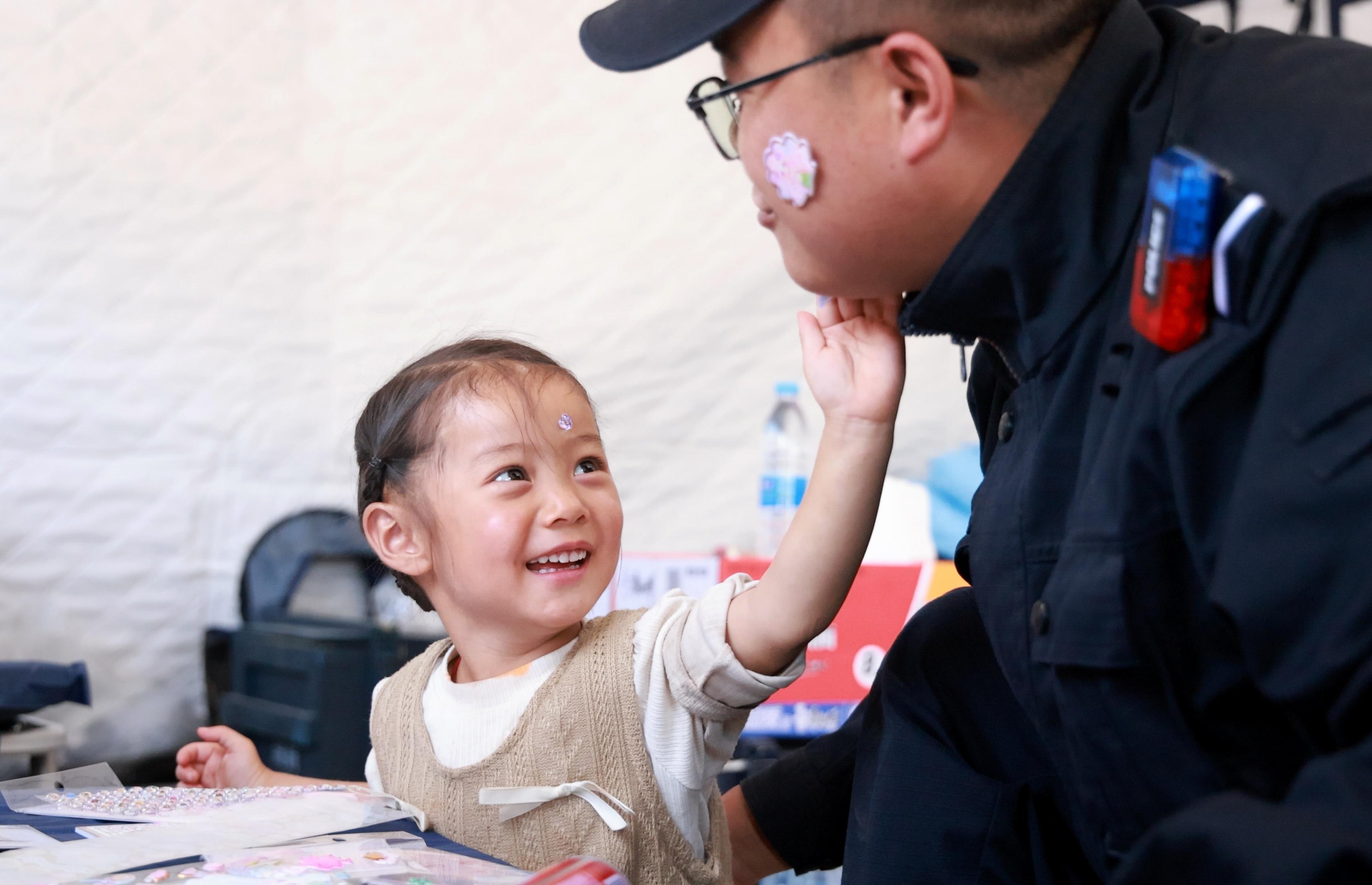 8月14日,瑤瑤在帳篷里給輔警張?jiān)品迥樕腺N貼紙。金萬貴 攝