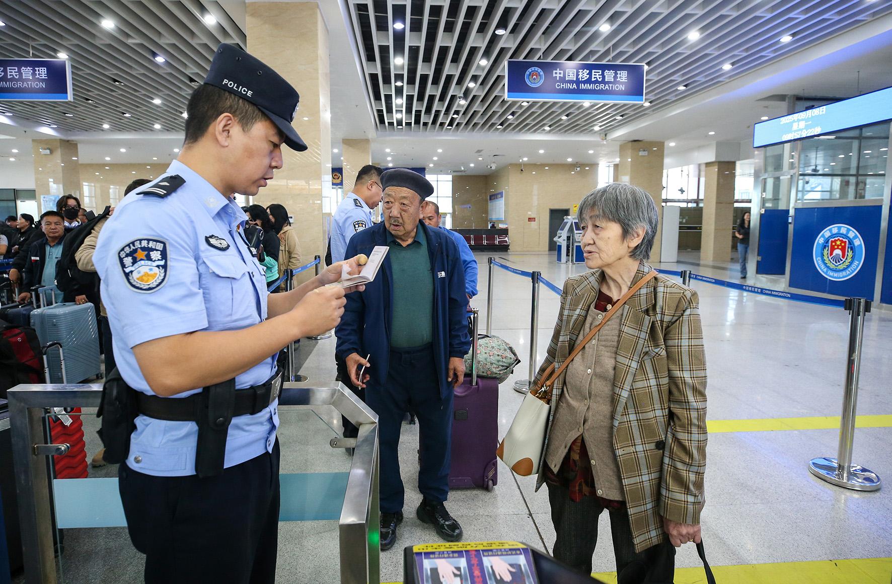 圖為9月8日,二連出入境邊防檢查站移民管理警察為老年旅客提供通關(guān)咨詢。