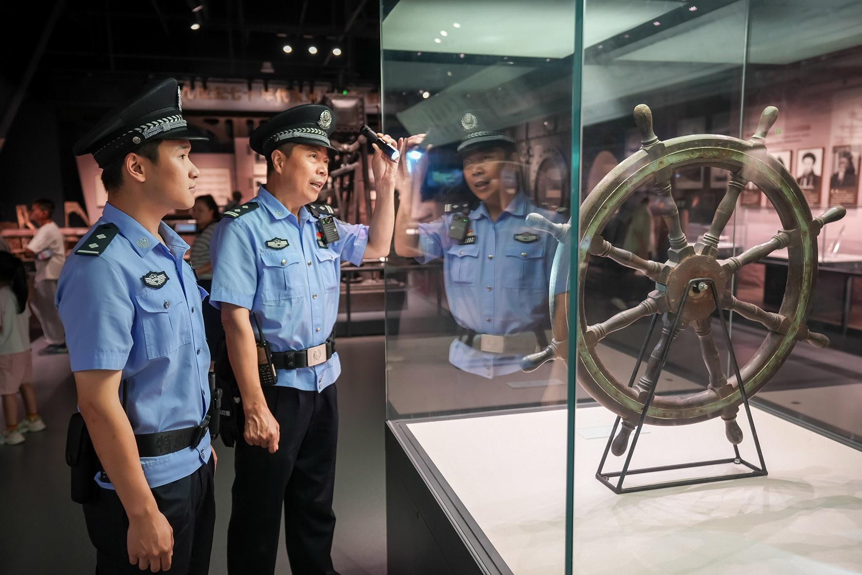 圖為快安派出所民警在中國(guó)船政文化景區(qū)檢查館藏文物展品安全情況。