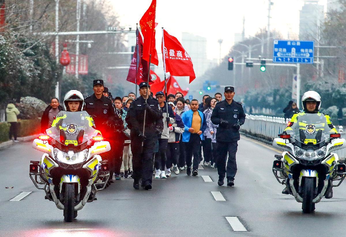 1月1日,安徽省淮北市公安局交通管理支隊(duì)相山大隊(duì)鐵騎隊(duì)員為元旦長(zhǎng)跑暨健身健步走活動(dòng)保駕護(hù)航。