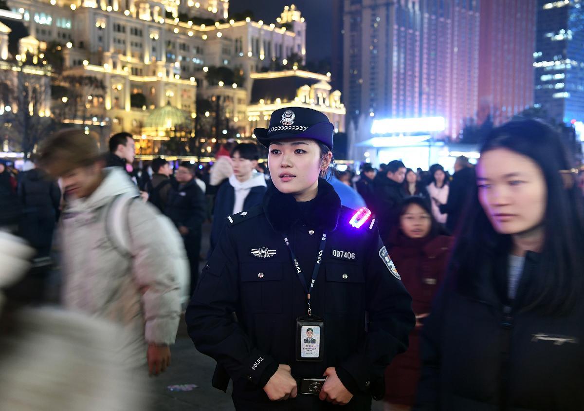 1月1日,河南省鄭州市公安局金水分局杜嶺派出所民輔警在轄區(qū)廣場(chǎng)執(zhí)勤巡邏。