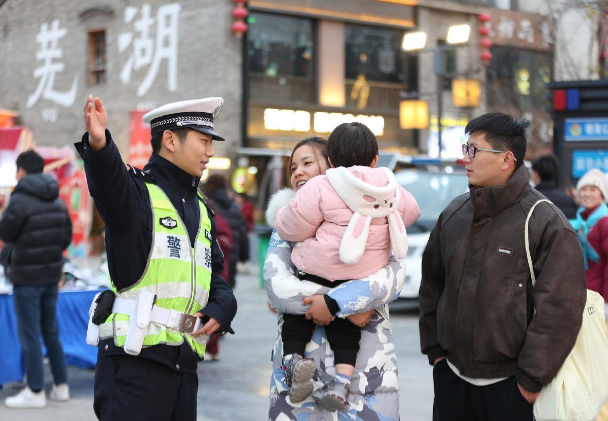 1月1日,安徽省蕪湖市公安局鏡湖交管大隊(duì)民警在古城景區(qū)執(zhí)勤,服務(wù)群眾。