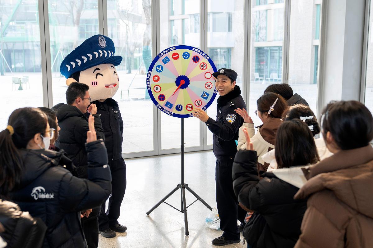 圖為民警與學(xué)生們開展交通安全知識有獎(jiǎng)問答。