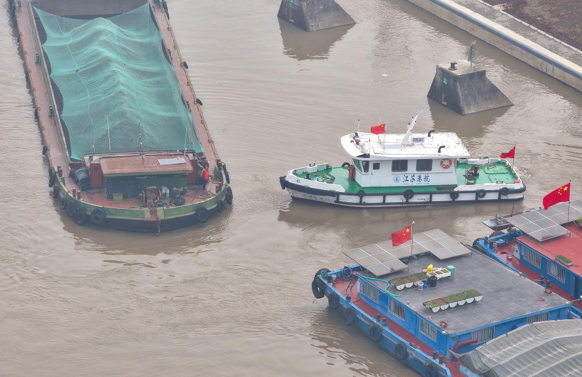 1月6日,江蘇省南通市港航事業(yè)發(fā)展中心工作艇在南通市崇川區(qū)通呂運河維持秩序,確保大霧天氣運河貨物運輸安全有序。