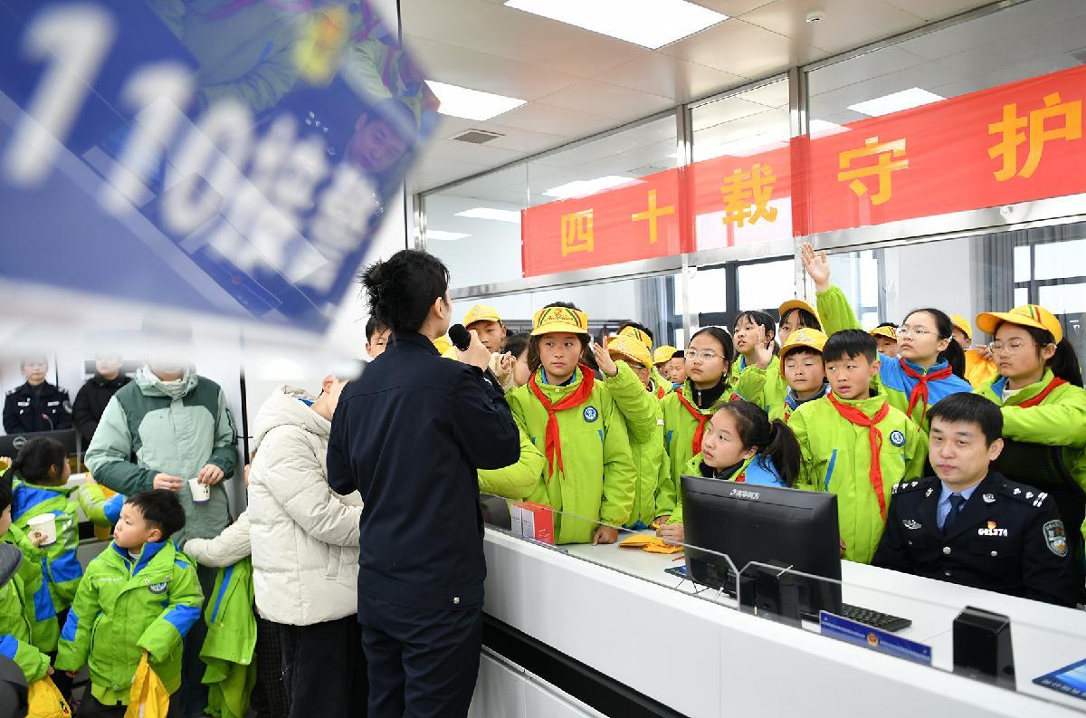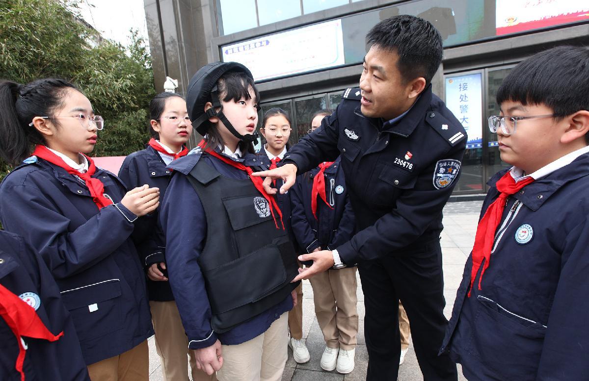 1月9日,江蘇省徐州市公安局鼓樓分局豐財派出所民警給小學生介紹警用裝備知識。當日,徐州市星源小學組織學生到豐財派出所參觀,了解警營文化,感受警察風采,喜迎中國人民警察節(jié)。