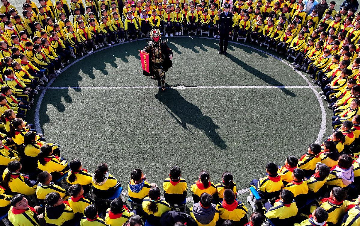 1月9日,在山東省棗莊市市中區(qū)齊村鎮(zhèn)渴口中心學校,棗莊市公安局市中分局一名輔警用“變臉”的表演方式向師生們宣傳法律知識。連日來,棗莊市公安局市中分局開展形式多樣的主題活動,迎接中國人民警察節(jié)的到來。