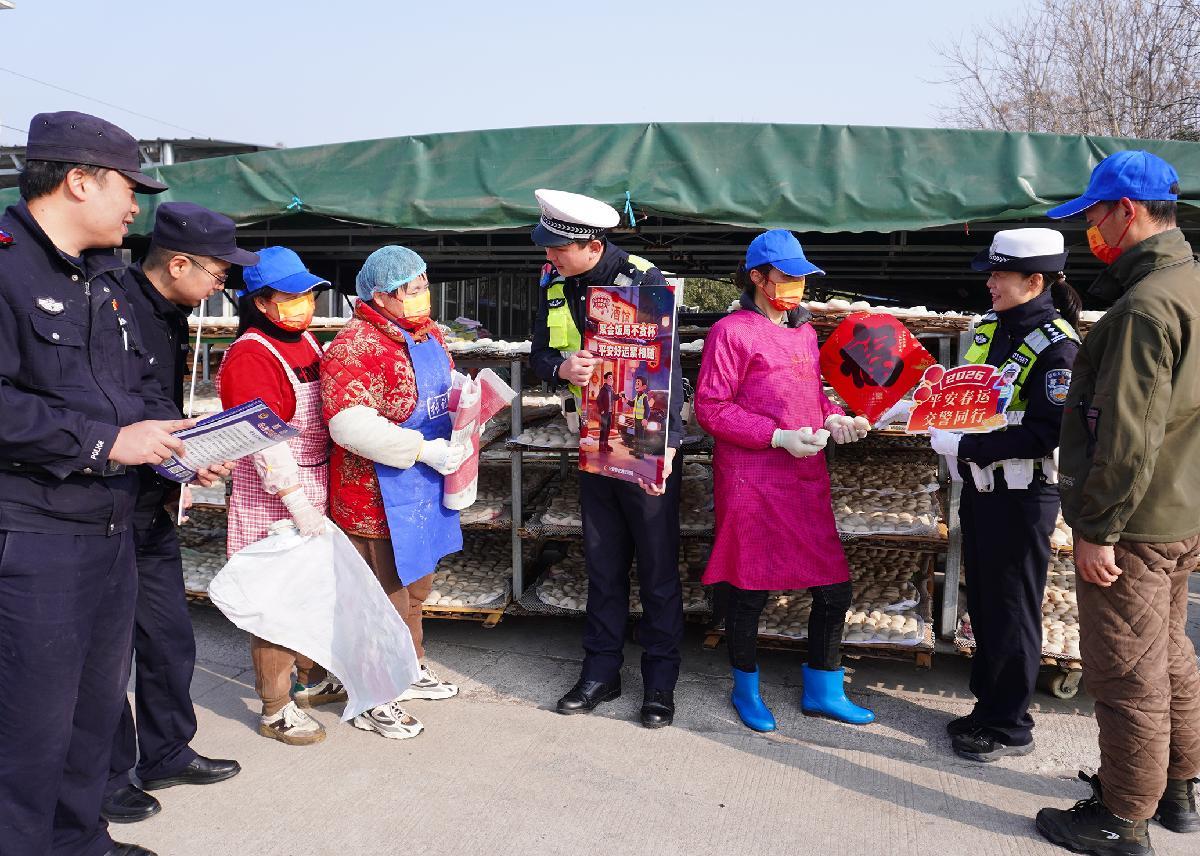 2月11日,安徽省蕪湖市公安局交管支隊弋江大隊組織民輔警來到花卉、年貨市場,開展“平安春運 交警同行”交通安全知識宣傳。