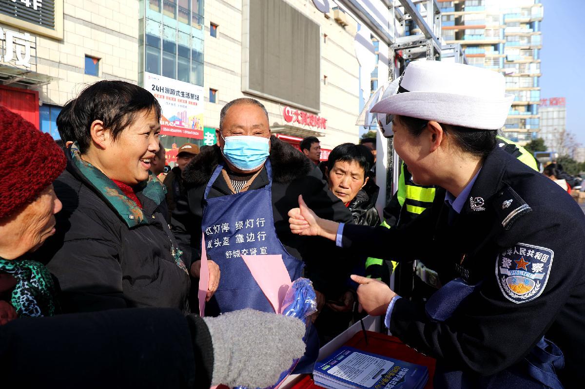 2月11日,安徽省舒城縣公安局交管大隊組織民輔警在集市“擺攤”,向群眾宣傳春節(jié)期間交通出行安全知識。
