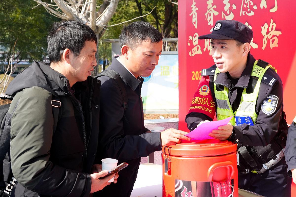 2月11日,杭州鐵路公安處臺州站派出所民警在便民服務(wù)崗為返鄉(xiāng)旅客送上暖身姜茶,并宣講安全出行和防詐騙知識。