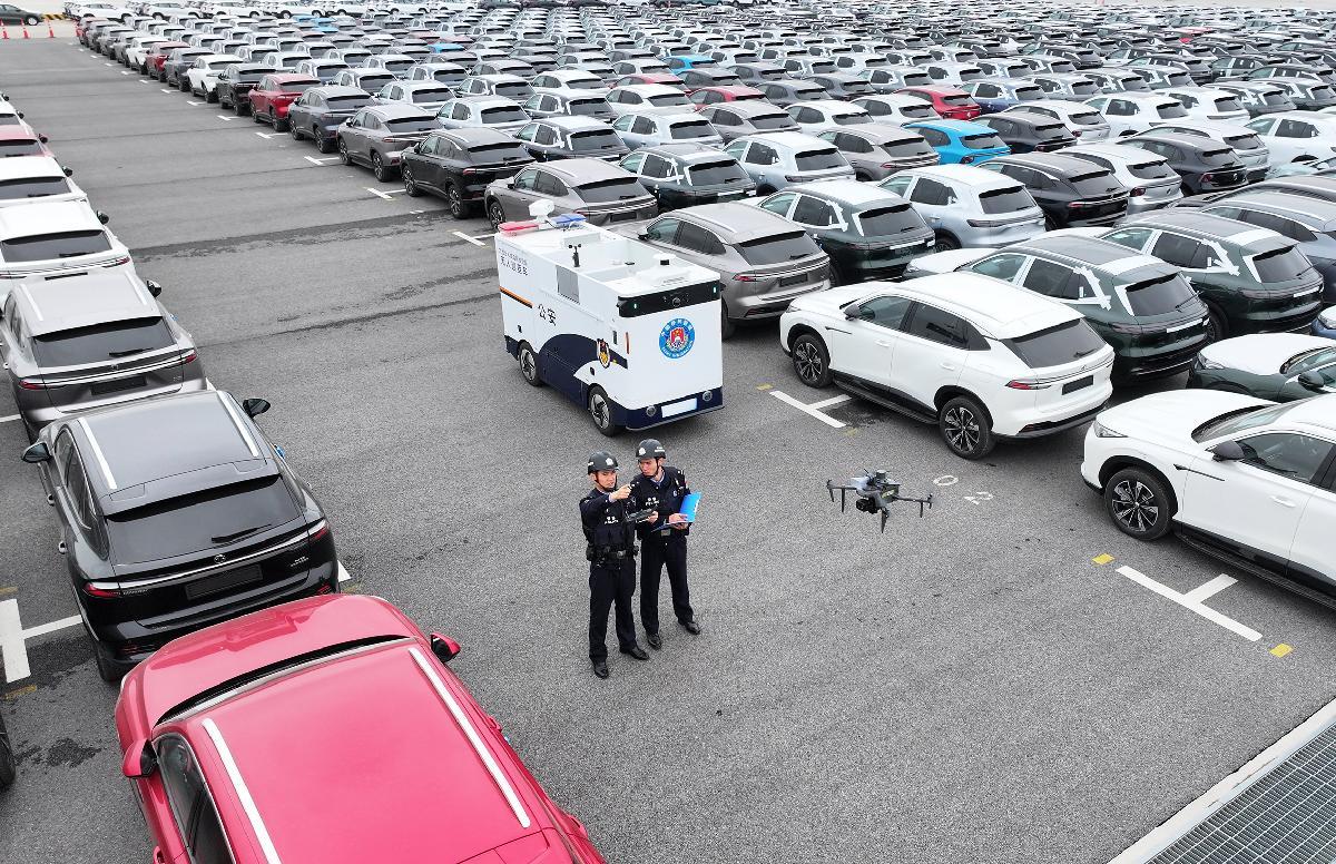 圖為民警使用警用無(wú)人機(jī)和無(wú)人巡查車在碼頭汽車堆場(chǎng)巡查。