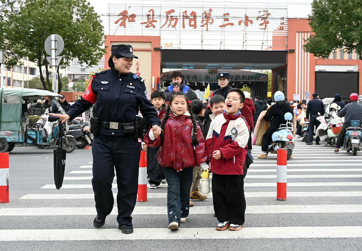 3月4日,安徽省馬鞍山市和縣公安局民警在歷陽(yáng)鎮(zhèn)第三小學(xué)護(hù)送學(xué)生安全通過(guò)馬路。當(dāng)日,和縣公安局全面啟動(dòng)“民警護(hù)學(xué)崗”,維護(hù)校園及周邊治安秩序,保障學(xué)生安全上下學(xué)。