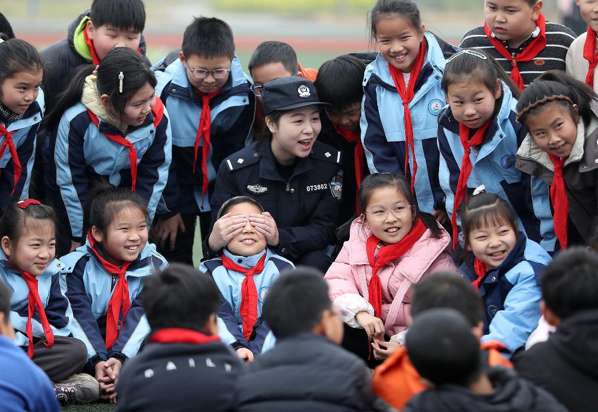 3月5日,在湖北省沙洋縣漢上實(shí)驗(yàn)學(xué)校“陽光大課間”活動(dòng)現(xiàn)場,沙洋縣公安局女民警通過“猜猜我是誰”游戲,為同學(xué)們普及實(shí)用的反詐防騙知識(shí)。