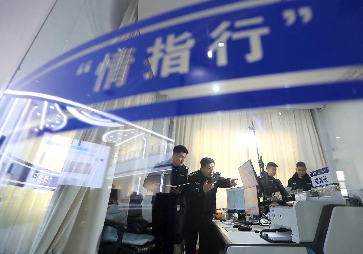 3月9日,在鐘祥市公安局“情指行”一體化作戰(zhàn)中心,民警郭威(中)與同事圍坐在監(jiān)控屏幕前,神情專注地分析畫面細(xì)節(jié)、推進(jìn)案情研判。