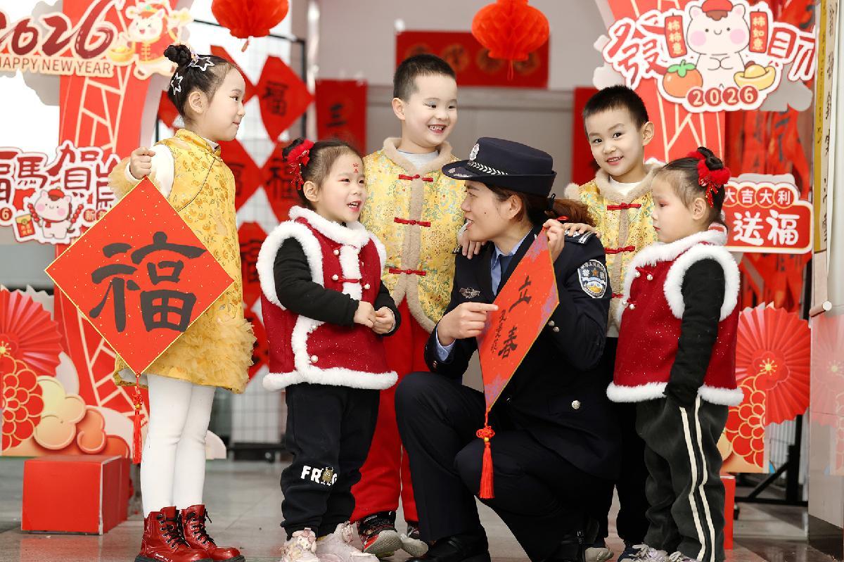 2月4日,山東省滕州市公安局民警走進(jìn)安居小學(xué)“春聯(lián)小屋”,與孩子們共同開展迎新春送福活動。