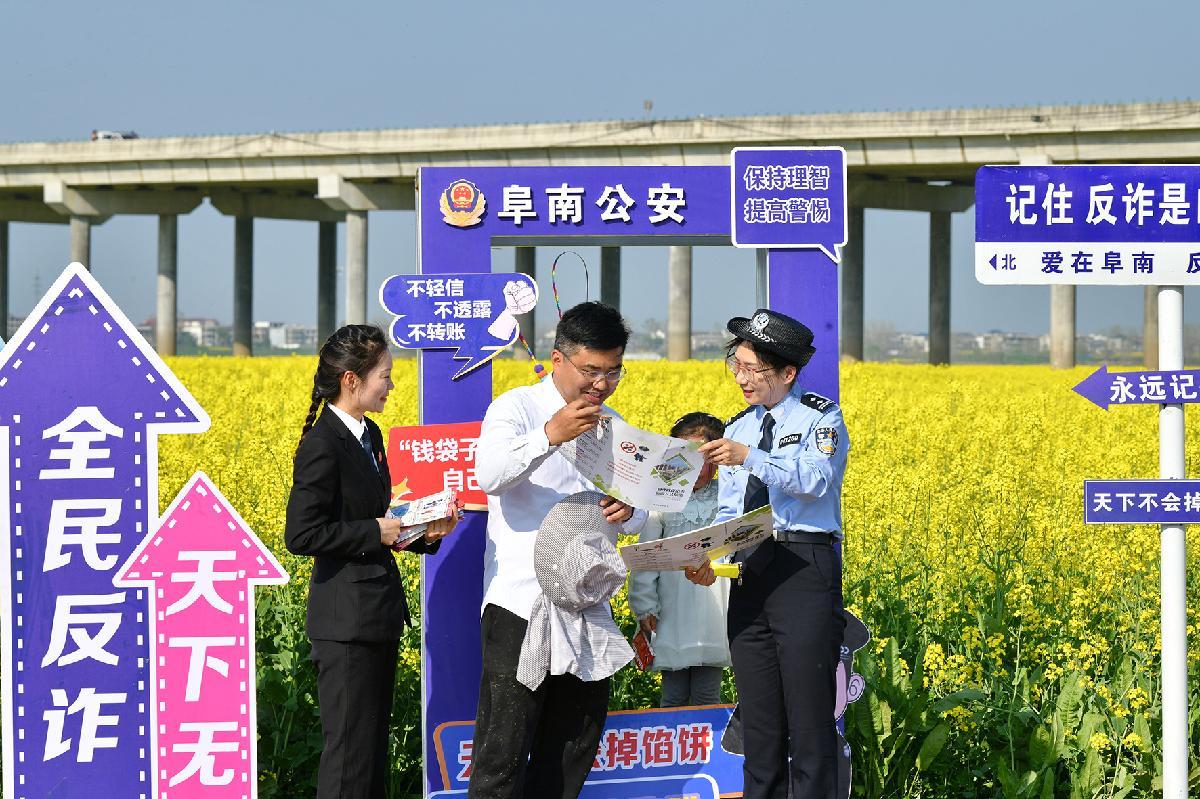 4月1日,安徽省阜南縣公安局經(jīng)偵大隊民警、阜南縣人民法院工作人員在中崗鎮(zhèn)千畝油菜花景區(qū)向游客宣講反詐知識。