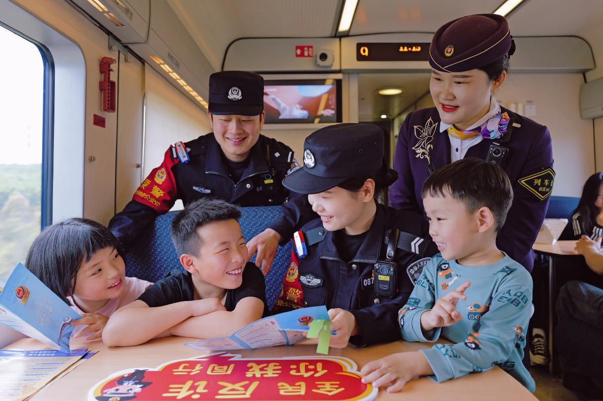 4月9日,在上海鐵路公安局杭州乘警支隊值乘的D2246次列車上,乘警與列車長主動為三名剛從英國返鄉(xiāng)探親、首次體驗乘坐高鐵的兒童講解列車安全知識,在溫馨的氣氛中守護旅途平安。