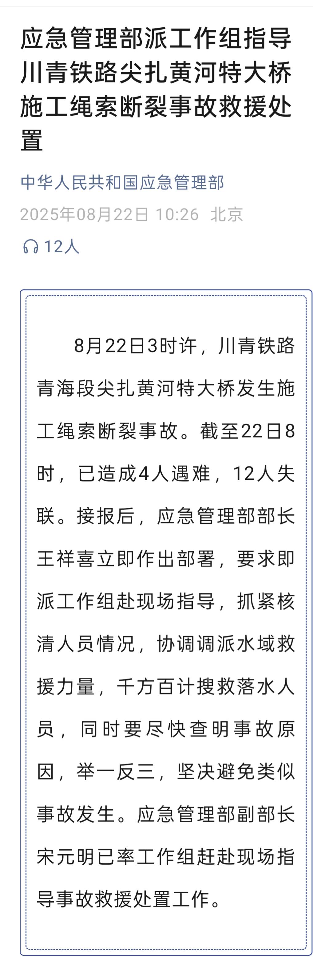 8月22日,應(yīng)急管理部發(fā)布消息,8月22日3時許,川青鐵路青海段尖扎黃河特大橋發(fā)生施工繩索斷裂事故。截至22日8時,已造成4人遇難,12人失聯(lián)。接報后,應(yīng)急管理部部長王祥喜立即作出部署,要求即派工作組赴現(xiàn)場指導(dǎo),抓緊核清人員情況,協(xié)調(diào)調(diào)派水域救援力量,千方百計搜救落水人員,同時要盡快查明事故原因,舉一反三,堅決避免類似事故發(fā)生。應(yīng)急管理部副部長宋元明已率工作組趕赴現(xiàn)場指導(dǎo)事故救援處置工作。