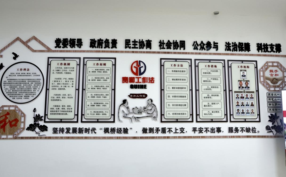 一個目標(biāo)是“和”,在貴和工作室,矛盾糾紛一站式接收、一攬子調(diào)處、全鏈條解決。兩種手段,是運用現(xiàn)代科技智能手段和傳統(tǒng)群眾工作手段。三大保障,是發(fā)揮黨組織三大作用,以保障貴和工作法得以推進實施。四個重點,是以管住“人”為中心,聚集防范風(fēng)險、化解矛盾、整改隱患、管控人員四個重點?!拔逯巍本褪翘N含國家治理方式現(xiàn)代化新要求的政治引領(lǐng)、法治保障、德治教化、自治強基、智治支撐。