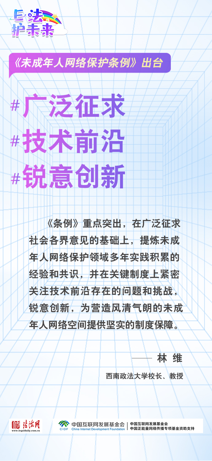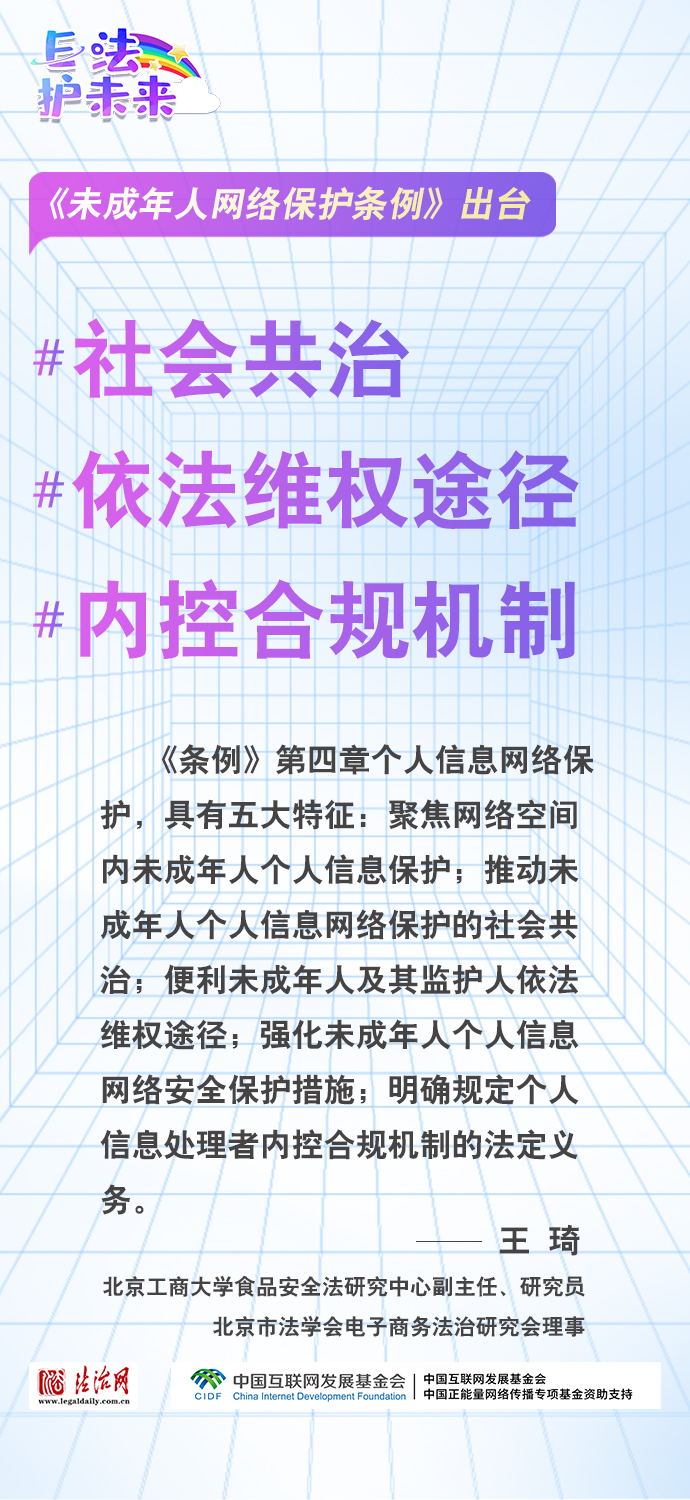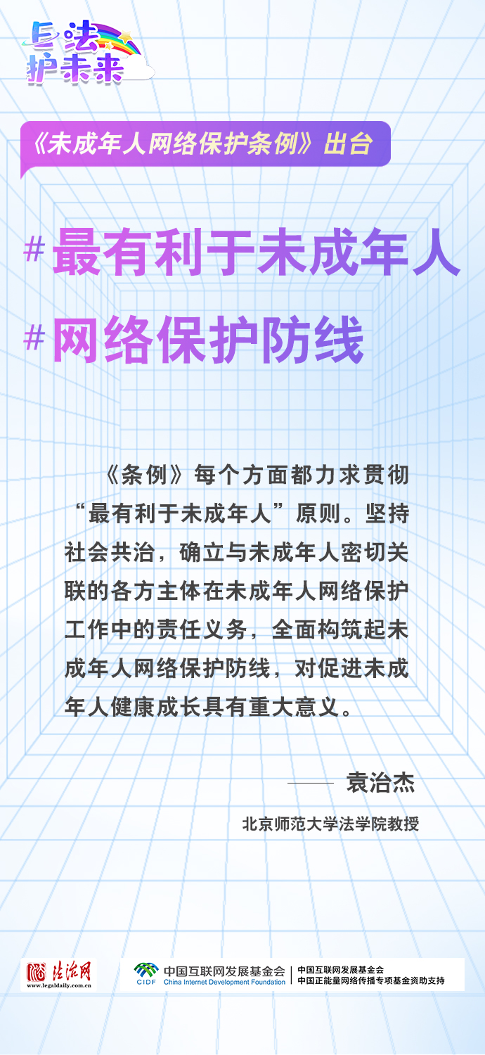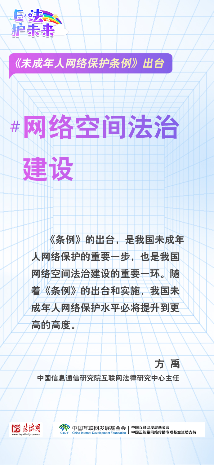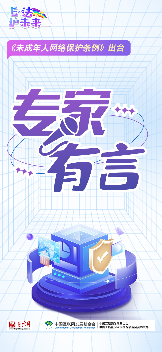 法治網(wǎng)特推出一組“專家有言”海報(bào),內(nèi)容涵蓋《條例》出臺的現(xiàn)實(shí)意義和時(shí)代價(jià)值、網(wǎng)絡(luò)素養(yǎng)促進(jìn)、網(wǎng)絡(luò)信息內(nèi)容規(guī)范、個(gè)人信息網(wǎng)絡(luò)保護(hù)、網(wǎng)絡(luò)沉迷防治等,充分展現(xiàn)《條例》的出臺是我國互聯(lián)網(wǎng)治理領(lǐng)域的法治成果,彰顯中國在未成年人網(wǎng)絡(luò)保護(hù)領(lǐng)域的擔(dān)當(dāng),為全球未成年人網(wǎng)絡(luò)空間治理提供指引和樣本。