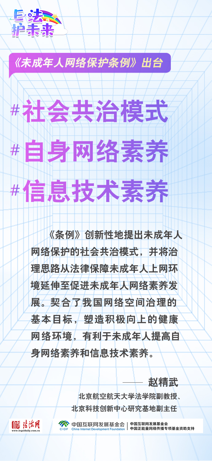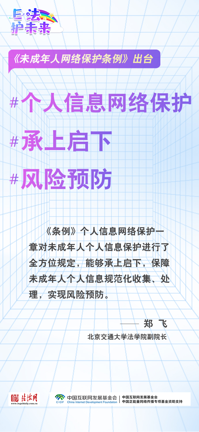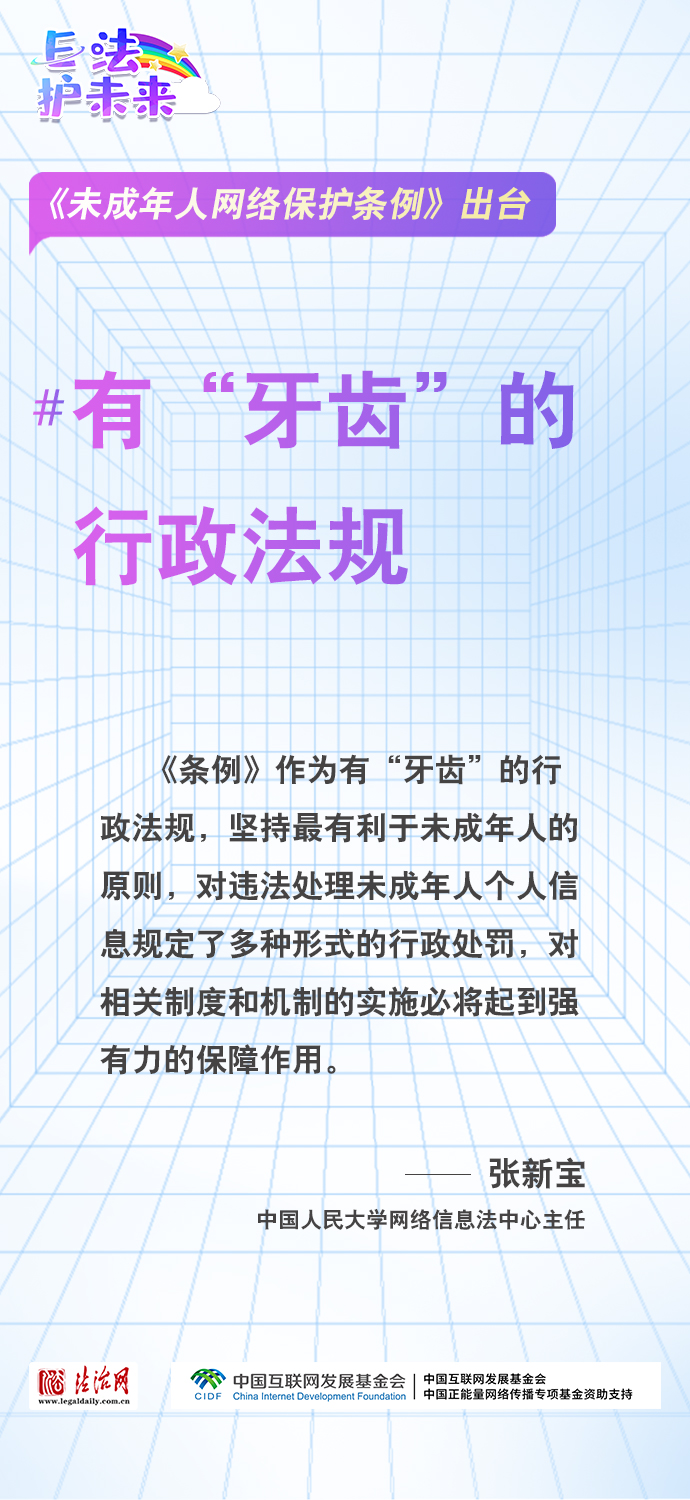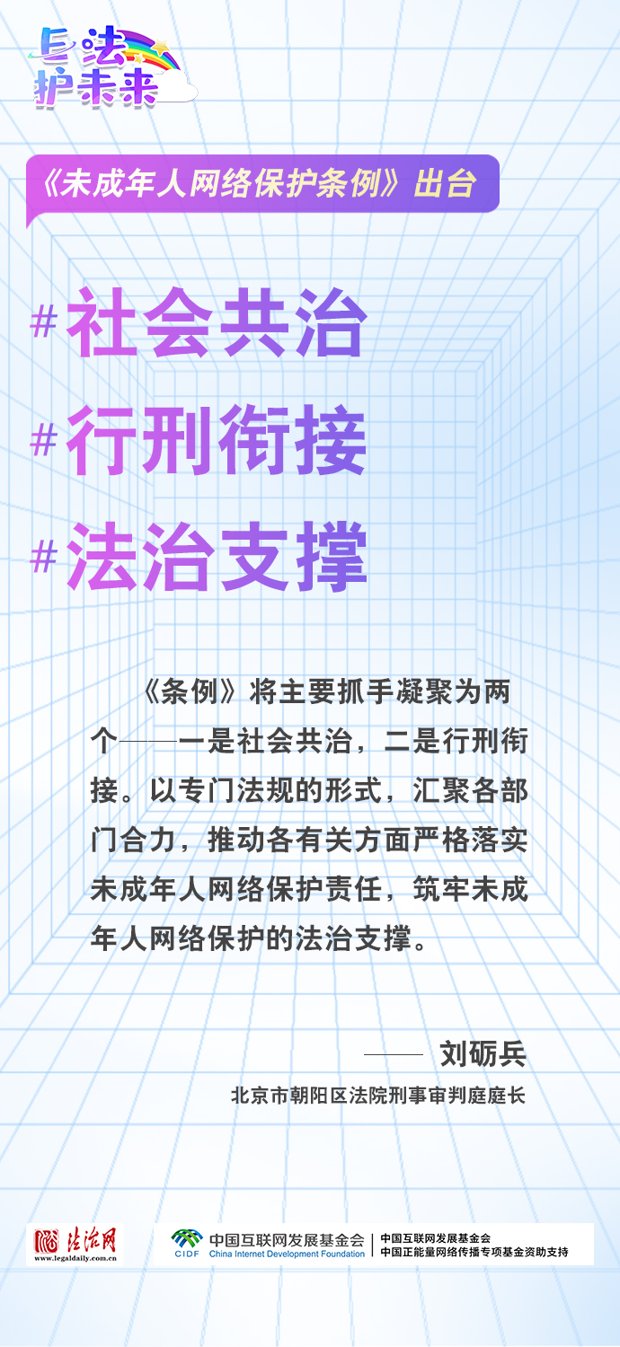 法治網(wǎng)特推出一組“專家有言”海報(bào),內(nèi)容涵蓋《條例》出臺的現(xiàn)實(shí)意義和時(shí)代價(jià)值、網(wǎng)絡(luò)素養(yǎng)促進(jìn)、網(wǎng)絡(luò)信息內(nèi)容規(guī)范、個(gè)人信息網(wǎng)絡(luò)保護(hù)、網(wǎng)絡(luò)沉迷防治等,充分展現(xiàn)《條例》的出臺是我國互聯(lián)網(wǎng)治理領(lǐng)域的法治成果,彰顯中國在未成年人網(wǎng)絡(luò)保護(hù)領(lǐng)域的擔(dān)當(dāng),為全球未成年人網(wǎng)絡(luò)空間治理提供指引和樣本。