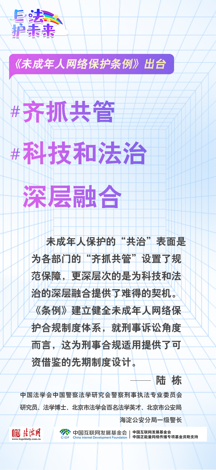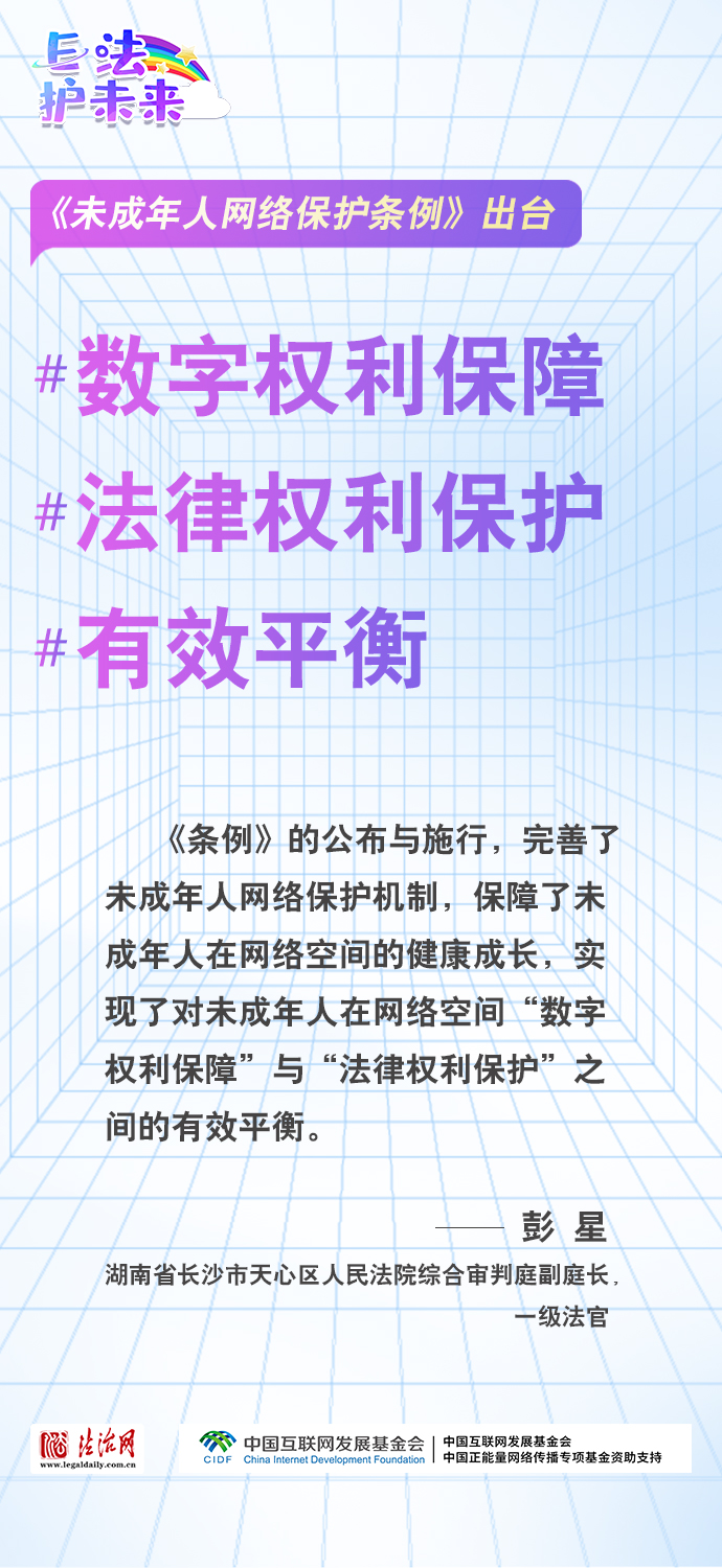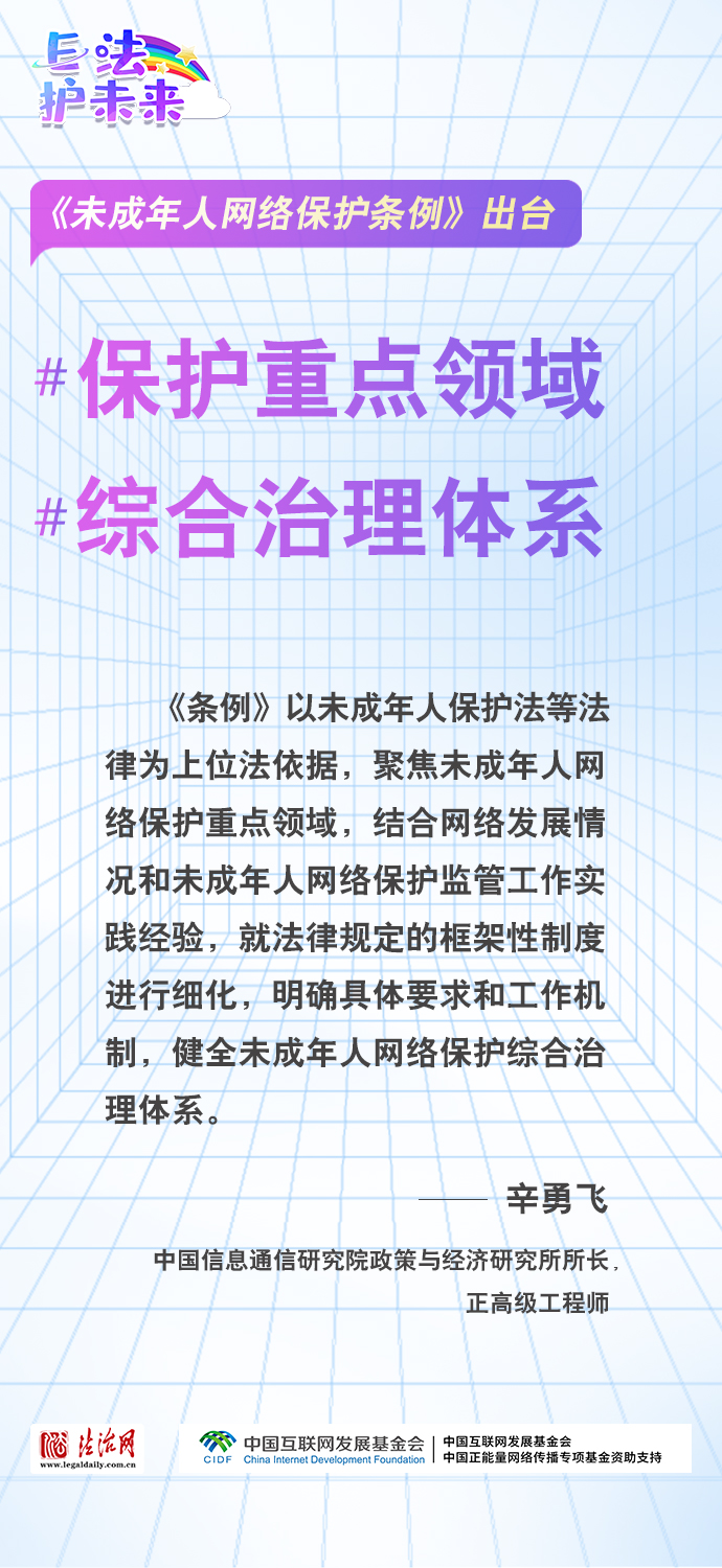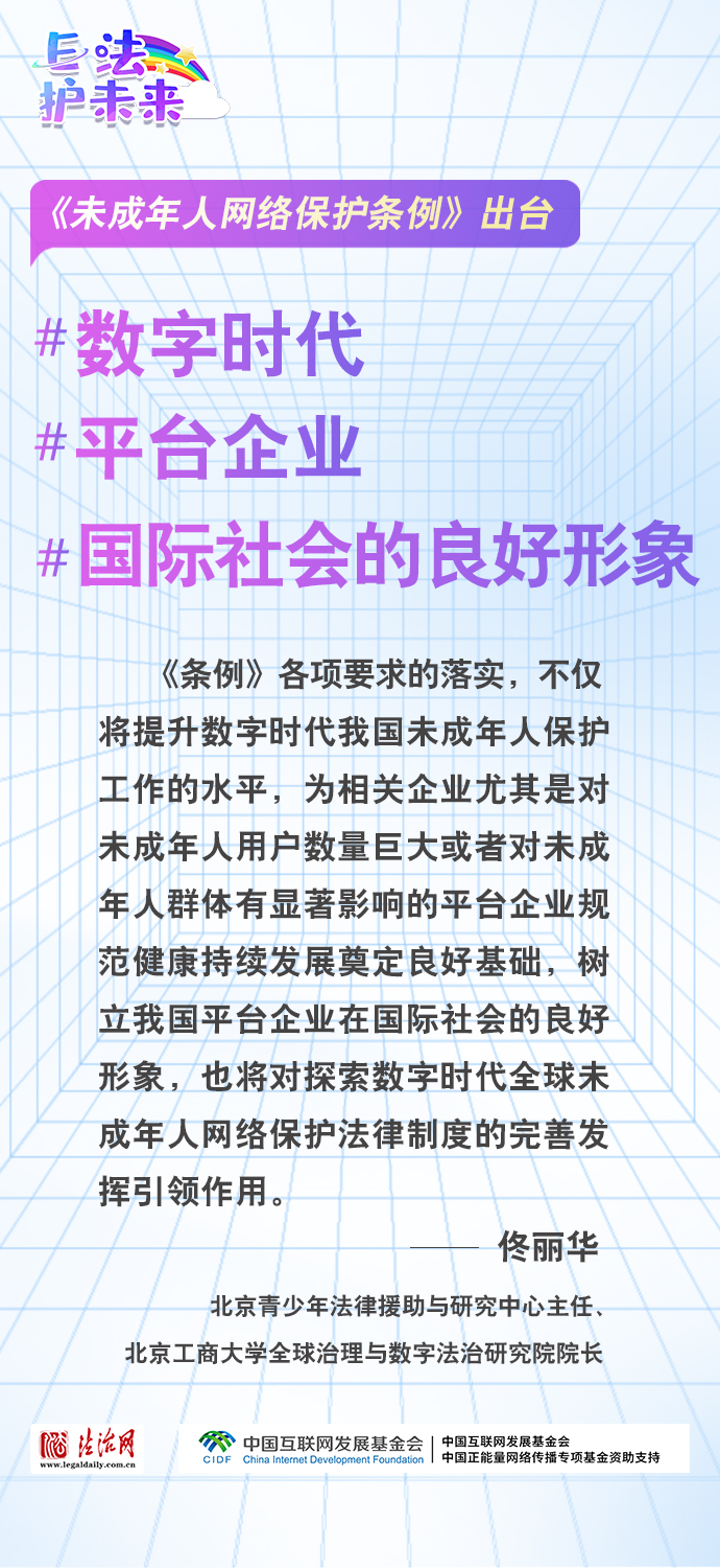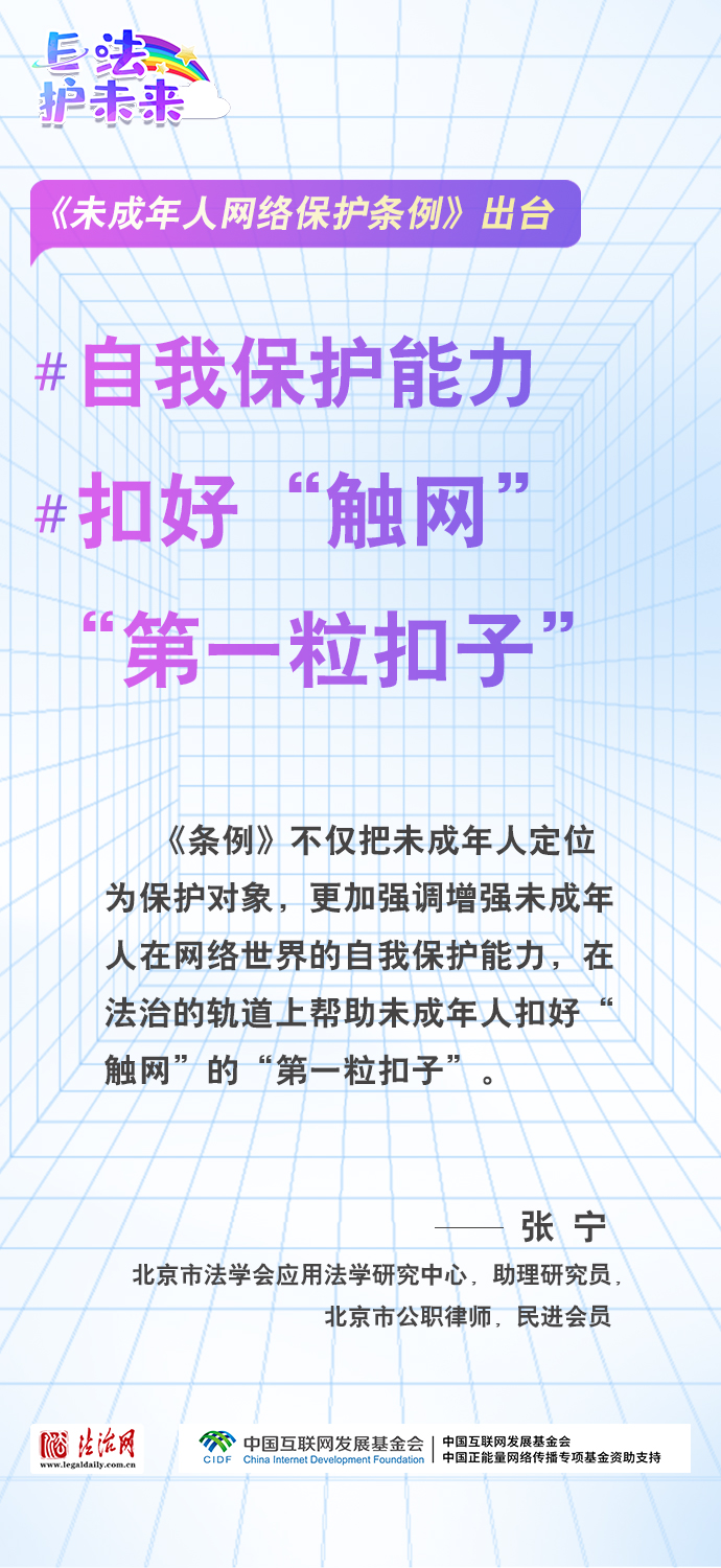 法治網(wǎng)特推出一組“專家有言”海報(bào),內(nèi)容涵蓋《條例》出臺的現(xiàn)實(shí)意義和時(shí)代價(jià)值、網(wǎng)絡(luò)素養(yǎng)促進(jìn)、網(wǎng)絡(luò)信息內(nèi)容規(guī)范、個(gè)人信息網(wǎng)絡(luò)保護(hù)、網(wǎng)絡(luò)沉迷防治等,充分展現(xiàn)《條例》的出臺是我國互聯(lián)網(wǎng)治理領(lǐng)域的法治成果,彰顯中國在未成年人網(wǎng)絡(luò)保護(hù)領(lǐng)域的擔(dān)當(dāng),為全球未成年人網(wǎng)絡(luò)空間治理提供指引和樣本。