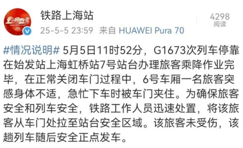 5月5日,網(wǎng)傳上海虹橋高鐵站又現(xiàn)“女子阻礙高鐵關(guān)門(mén)”事件。視頻顯示,有目擊者稱(chēng),女子此舉是為了等后面的老太太。當(dāng)日深夜,“@鐵路上海站”通報(bào)稱(chēng),當(dāng)事旅客因突感身體不適,急忙下車(chē)時(shí)被門(mén)夾住,工作人員迅速將其拉至安全區(qū)域。該旅客未受傷,該趟列車(chē)隨后安全正點(diǎn)發(fā)車(chē)。通報(bào)發(fā)出后,多數(shù)網(wǎng)民表示理解,但也有網(wǎng)民并不認(rèn)同上海鐵路方的處理方式,認(rèn)為如果以后都可以用這些理由,會(huì)引發(fā)更多人效仿。