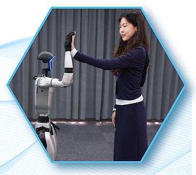 在浙江杭州宇樹科技展廳,機(jī)器人展示擊掌動(dòng)作。 新華社記者??黃宗治攝