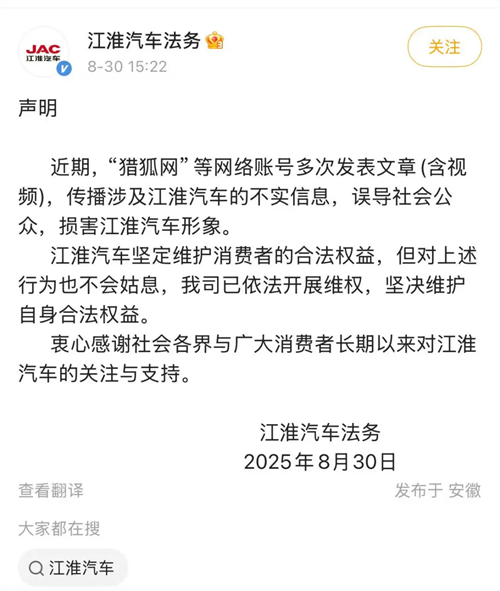 而在前一天的8月30日,@江淮汽車法務(wù)發(fā)布聲明:近期,“獵狐網(wǎng)”等網(wǎng)絡(luò)賬號多次發(fā)表文章(含視頻),傳播涉及江淮汽車的不實(shí)信息,誤導(dǎo)社會公眾,損害江淮汽車形象。江淮汽車堅(jiān)定維護(hù)消費(fèi)者的合法權(quán)益,但對上述行為也不會姑息,我司已依法開展維權(quán),堅(jiān)決維護(hù)自身合法權(quán)益。